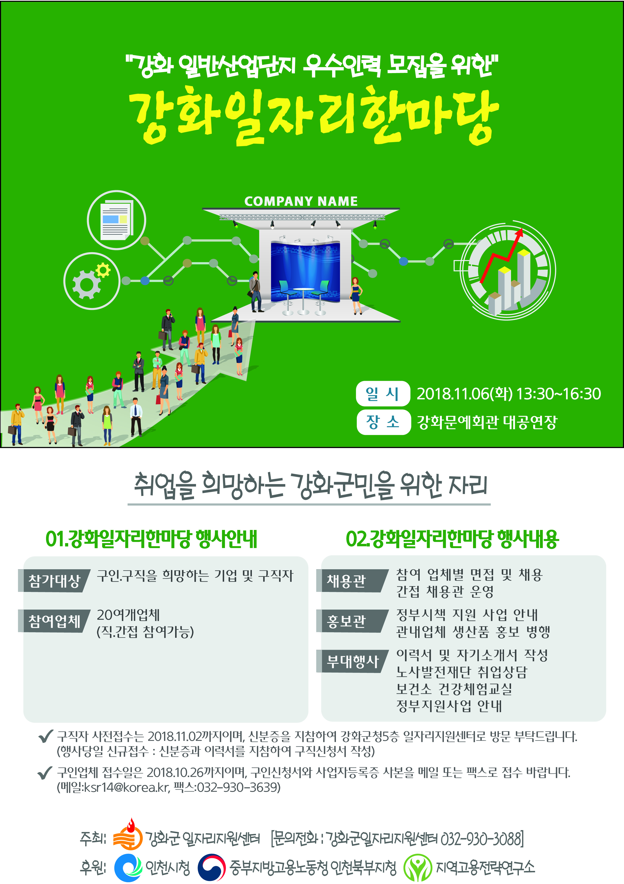 강화일자리한마당을 통해 일자리창출과 강화군민분들의 실업난을 해소하기 위해 강화일자리한마당을 개최합니다.