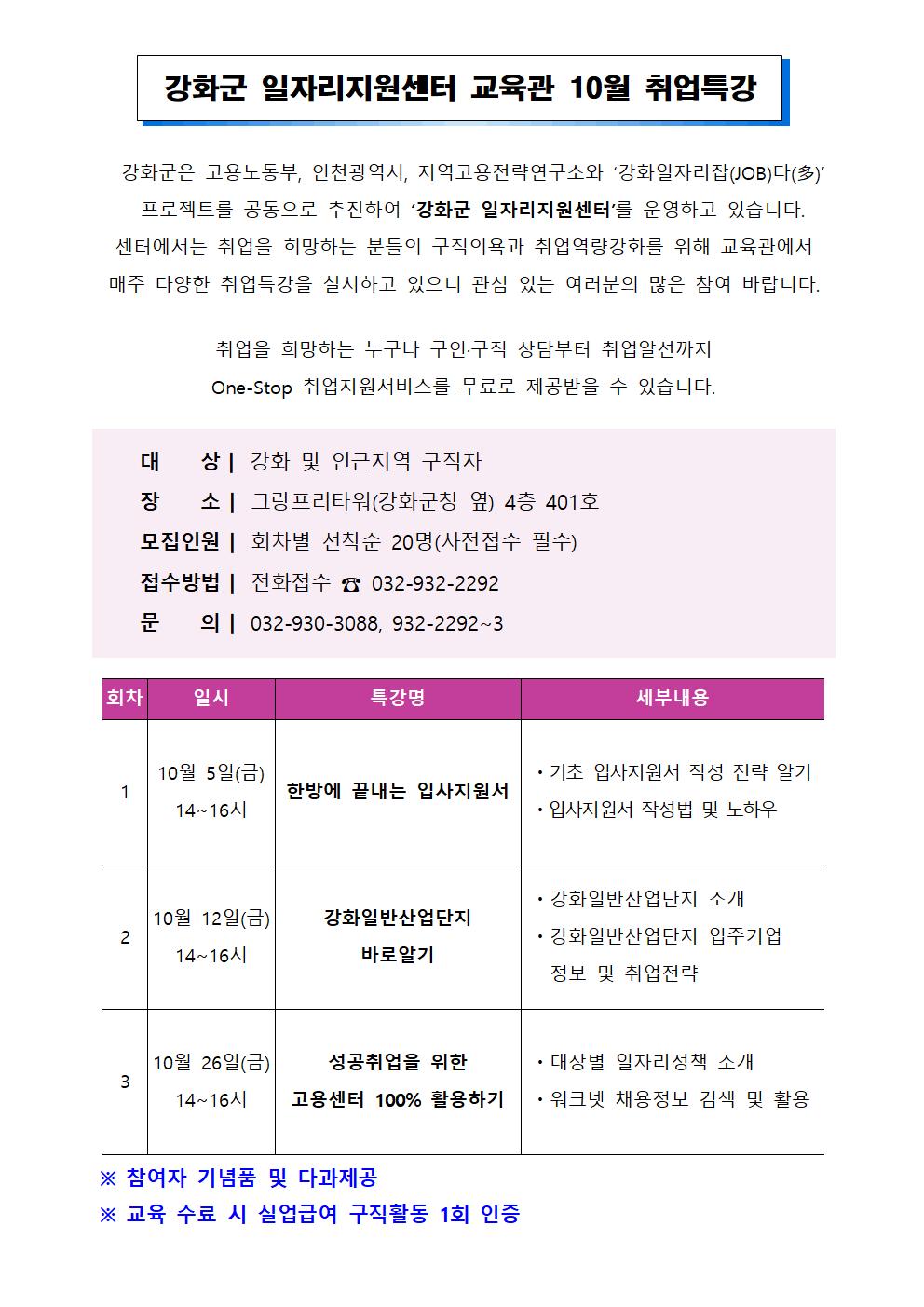 강화군 일자리지원센터 교육관 10월 취업특강 안내