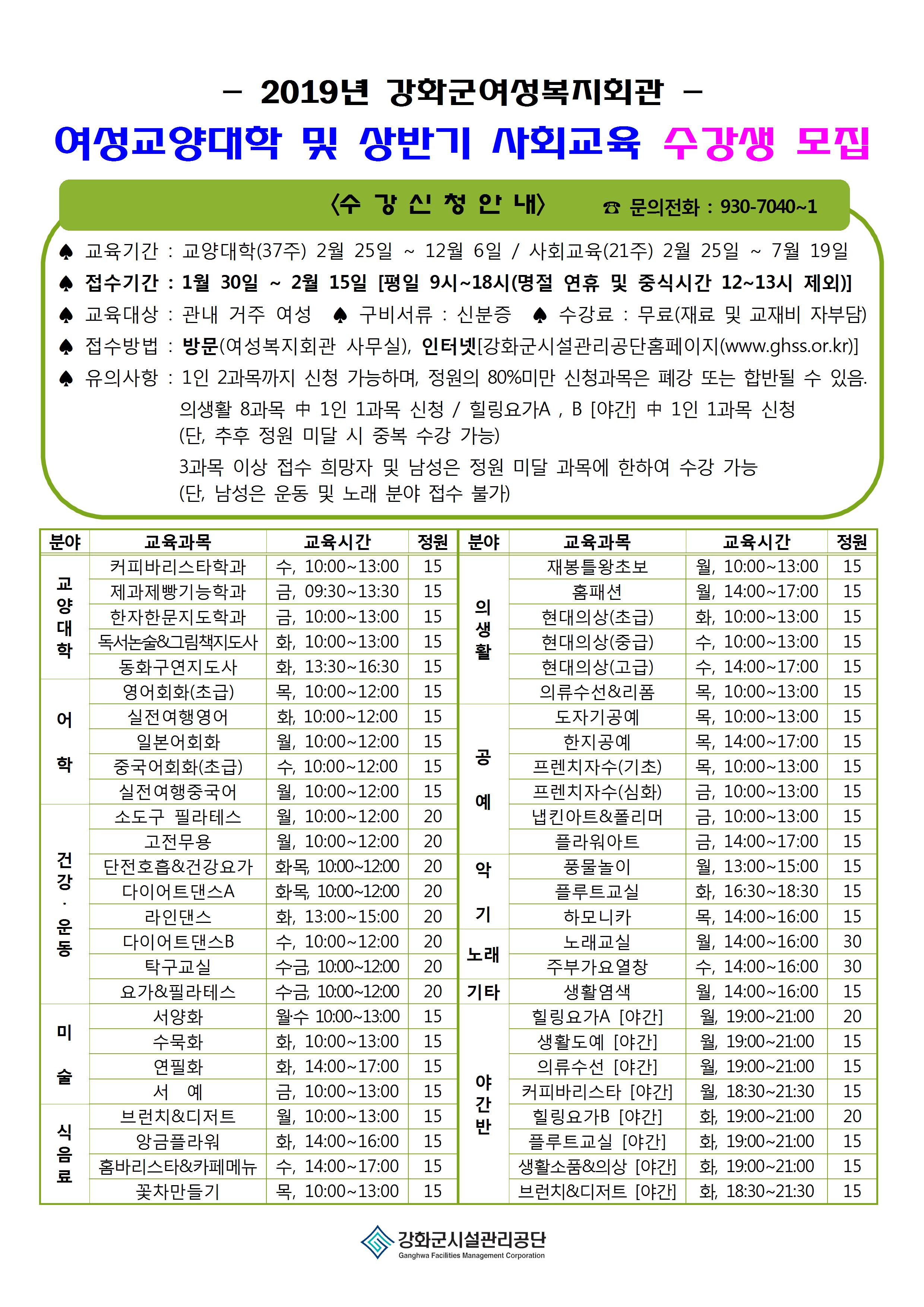 2019년 강화군여성복지회관 프로그램 수강생을 붙임과 같이 모집합니다.