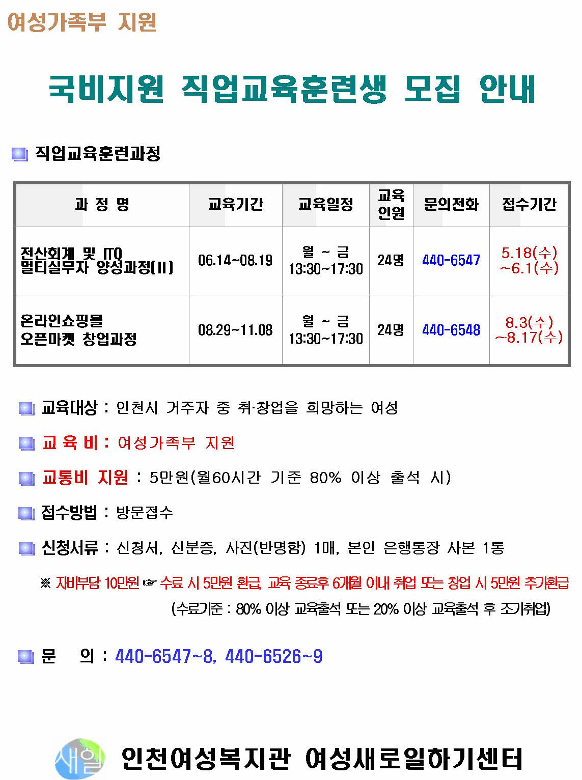 여성가족부 국비지원 직업교육훈련생 모집 안내