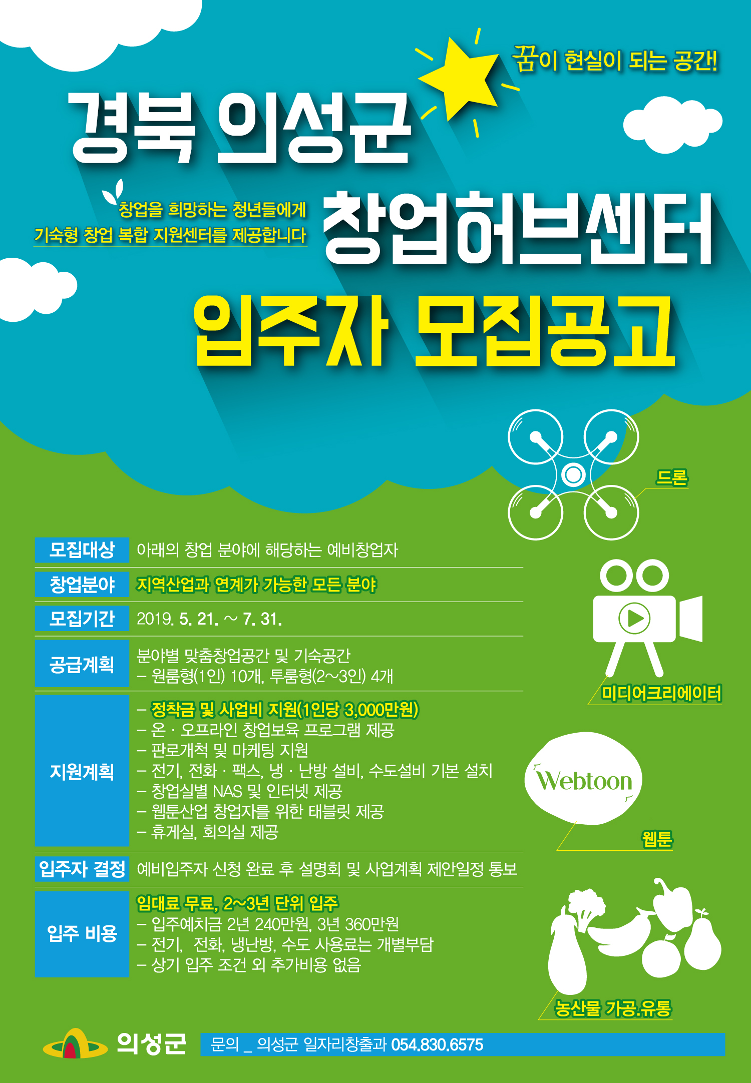 「의성군 창업허브센터」에서 창의적이고 열정을 지닌 예비 청년 창업가를 다음과 같이 모집하오니, 관심 있는 예비 청년 창업가의 많은 지원 바랍니다.