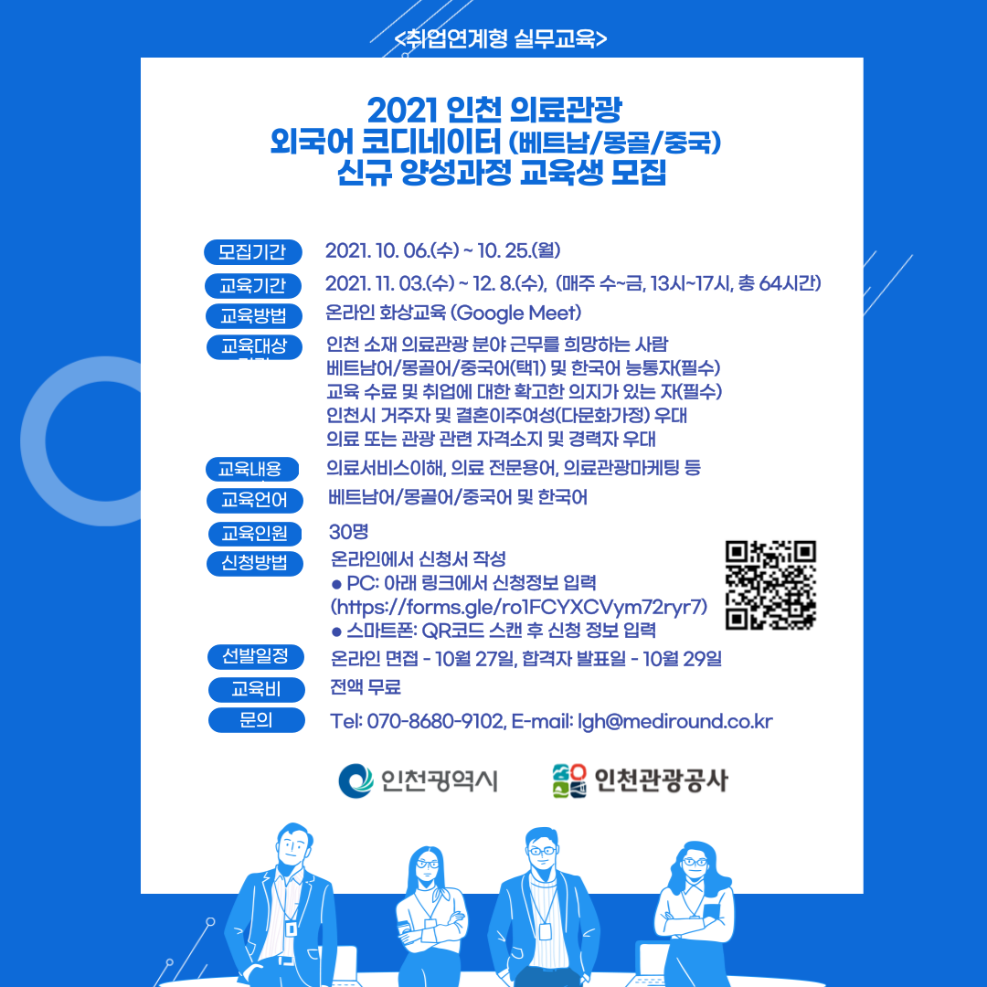 가. 교 육 명 : 2021 인천 의료관광 외국어 코디네이터 신규양성과정 나. 모집 기간 : 2021.10.6.(수) ~ 10.25.(월) 다. 교육 기간 : 2021.11.3.(수) ~ 12.08.(수) (매주 수~금, 13시~17시, 총 64시간) 라. 교육 방법 : 온라인 화상교육(google meet) 마. 교육 대상 : 인천 소재 의료관광 분야 근무를 희망하는 사람 (필수) 베트남어/몽골어/중국어(택1) 및 한국어 능통자 (필수) 교육 수료 및 취업에 대한 확고한 의지가 있는 자 (우대) 인천시 거주자 및 결혼이주여성(다문화가정) (우대) 의료 또는 관광 관련 자격소지 및 경력자 우대 바. 교육 내용 : 의료서비스의 이해, 의료 전문용어, 의료관광마케팅 등 사. 교육 언어 : 베트남어/몽골어/중걱어 및 한국어 아. 교육 인원 : 30여 명 자. 신청 방법 : 첨부 포스터 참조 ○ 문의 사항 : 070-8680-9102 |
