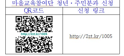 ㅇ 신청방 : QR코드·신청 링크 접속 후 개별 신청※ 마을교육참여단 확정 후 선정된 사람에 한해 개별 연락