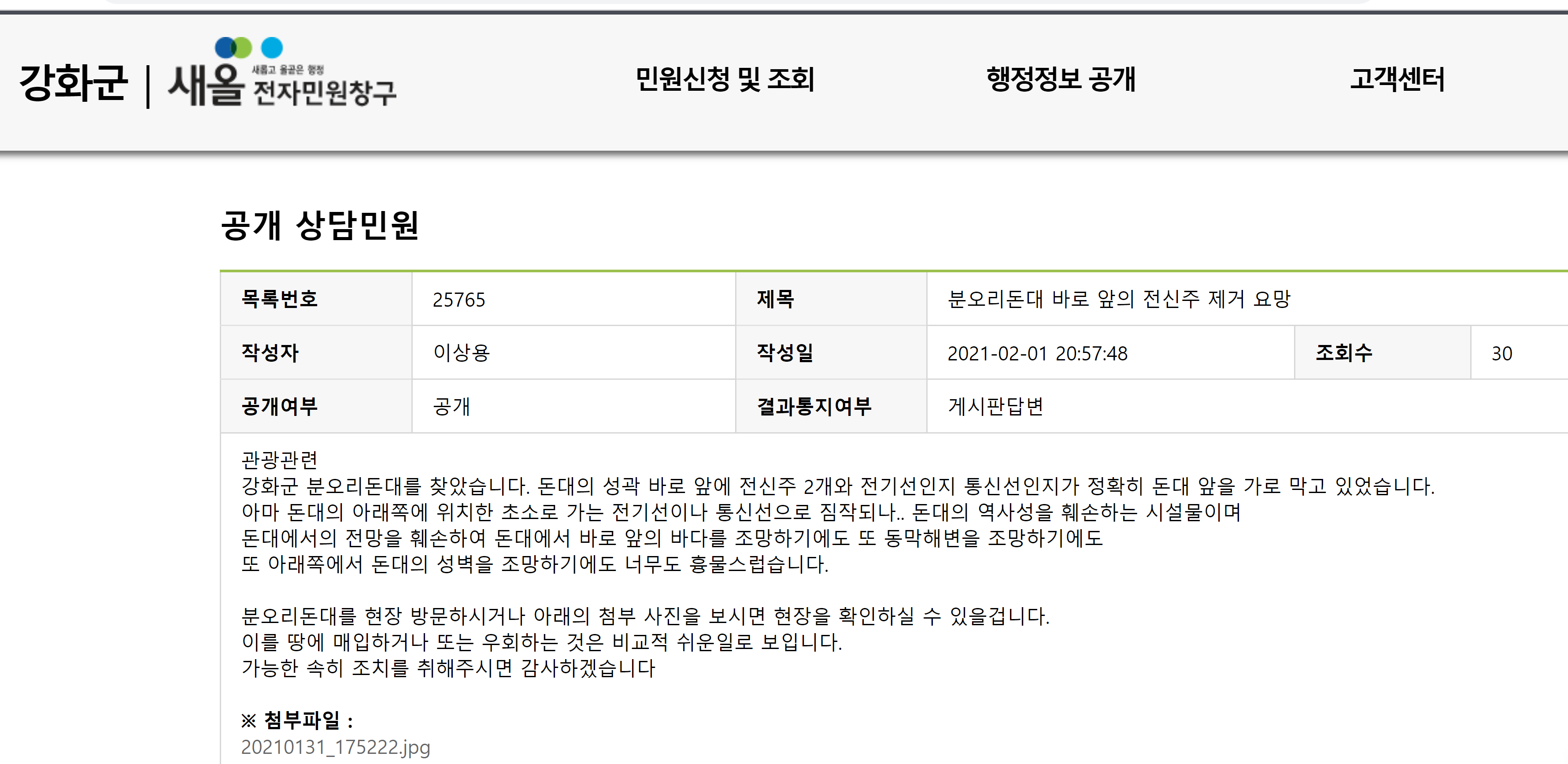 강화 분오리돈대 앞의 통신선과 철제지주 철거에 관한 민원처리 해주신 관계자 분께 감사드려요