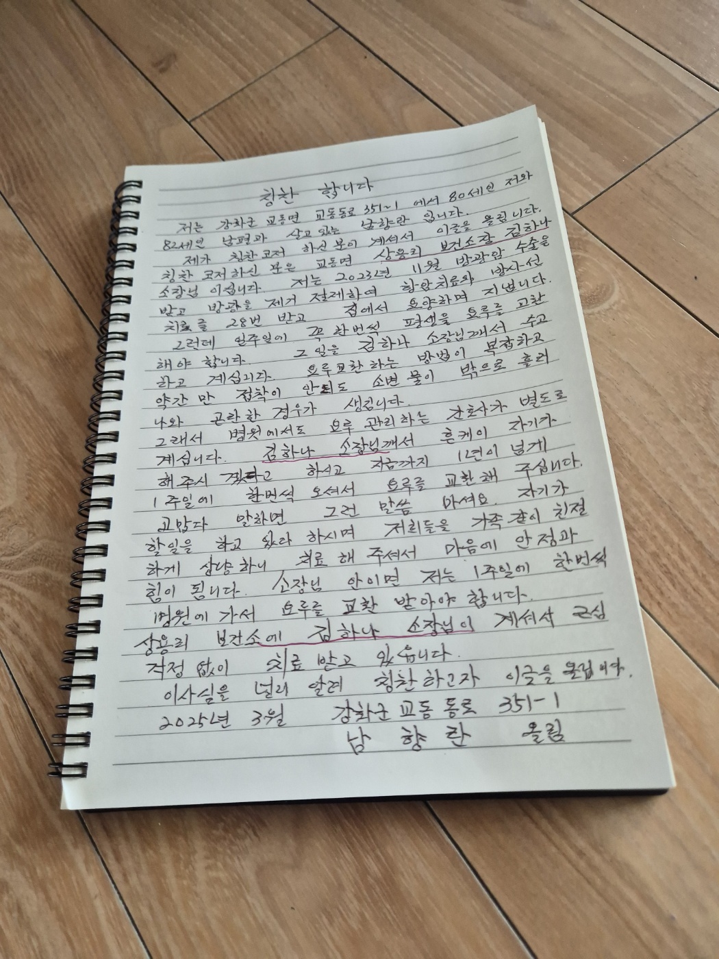 이러한 아픔을 알아주셔서 김하나 소장님은 자진하여 일주일에 한번씩 어머니의 요루주머니를 수술후 1년 이상 갈아주시고 계십니다. 아무런 보답도 받지 않으시고 몸이 아픈 어르신을 진심으로 보살펴 주시는 소장님께 다시 한 번 깊은 감사를 드리며, 어머니께서 감사의 마음으로 친필로 쓰신 편지를 붙여드립니다. 어머니는 정말 감사하고 표현하고 싶은 데 본인은 할 줄 모르니 아들인 저에게 이 분께 감사한 마음을 꼭 알렸으면 좋겠다고 신신당부하십니다.