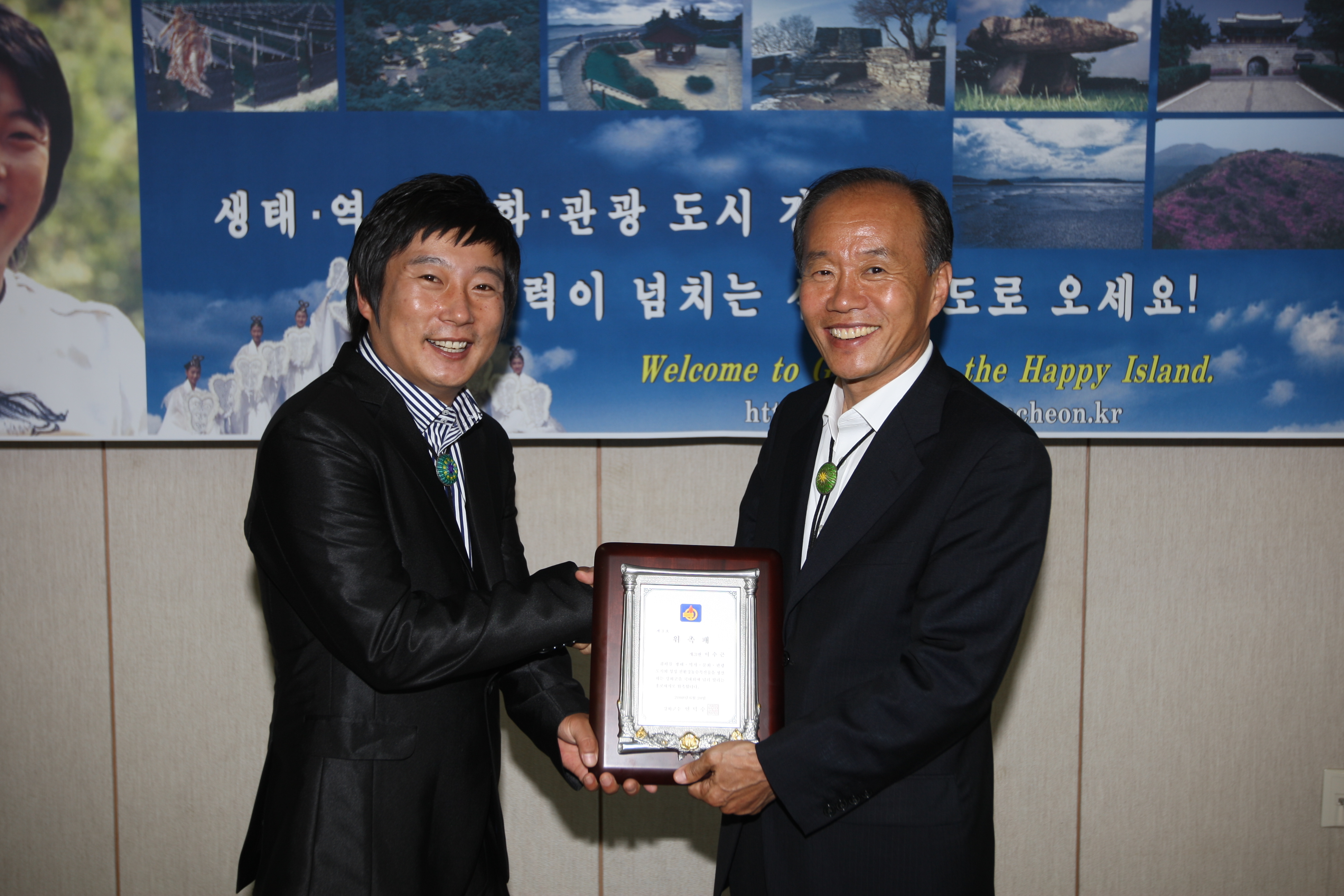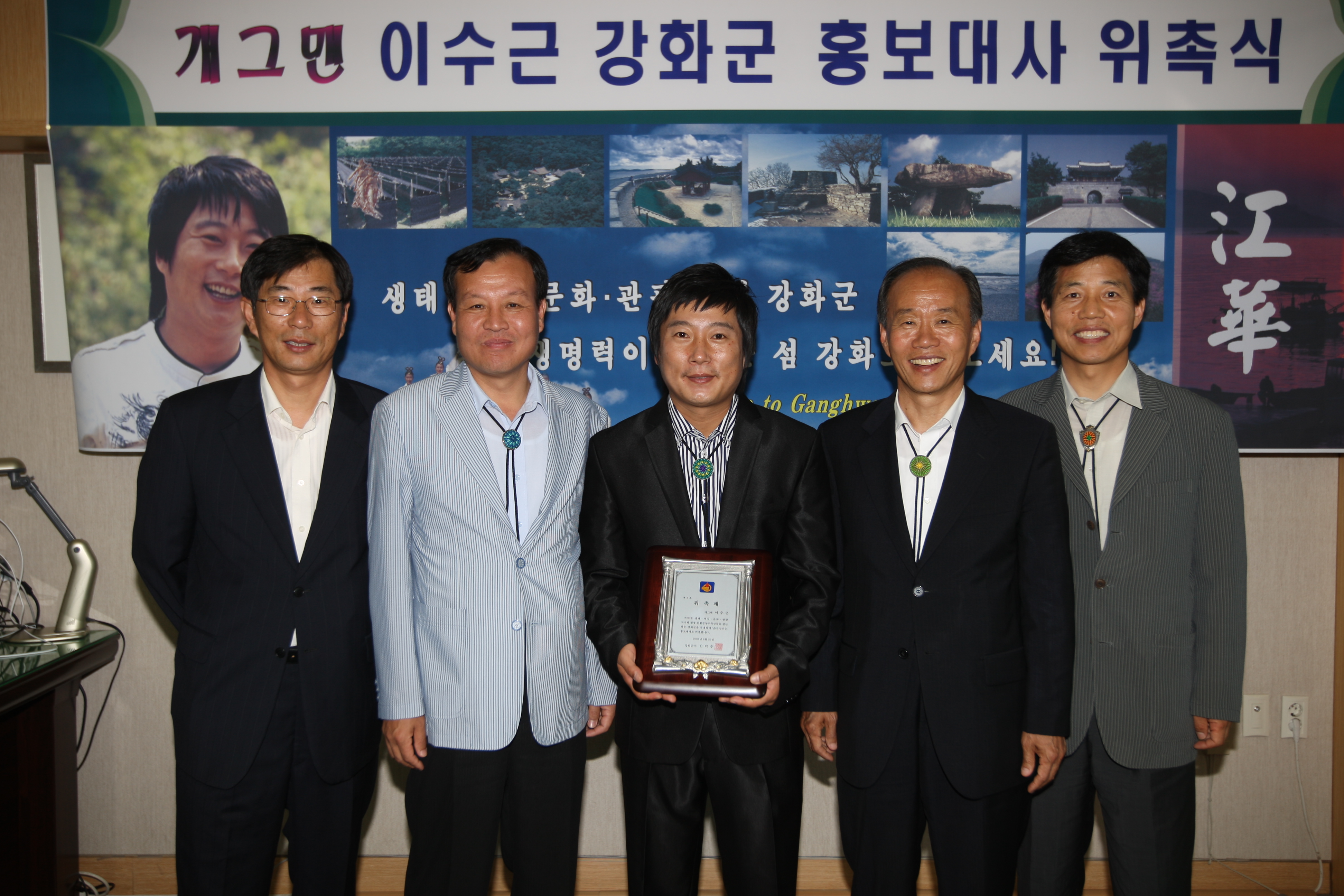안덕수 강화군수는 이날 군수실에서 이수근씨를 강화군 홍보대사로 위촉패를 수여하고 “바쁜 방송활동에도 불구하고 강화군 홍보대사로 흔쾌히 응 해줘 매우 기쁘다”며, “강화군은 세계 제1의 생태ㆍ역사ㆍ문화ㆍ관광휴양 중심도시로 발전해 나가고 있다”면서, 지난 봄 고려산진달래예술제, 고인돌문화축제 그리고 오는 28일. 29일에 걸쳐 마니산의 자랑인 氣를 세계화하기 위해 개최하는 마니산 氣축제, 7월 선원사 연꽃축제, 정수사 상사화축제, 10월의 개천대축제, 새우젓축제, 전등사 삼랑성 문화축제, 그리고 강화군 곳곳에 산재한 역사문화재 등과 함께 4계절이 아름답고 즐거움으로 가득찬 강화군의 문화ㆍ관광, 친환경 농특산물 등에 대한 활발한 홍보활동을 당부했다.