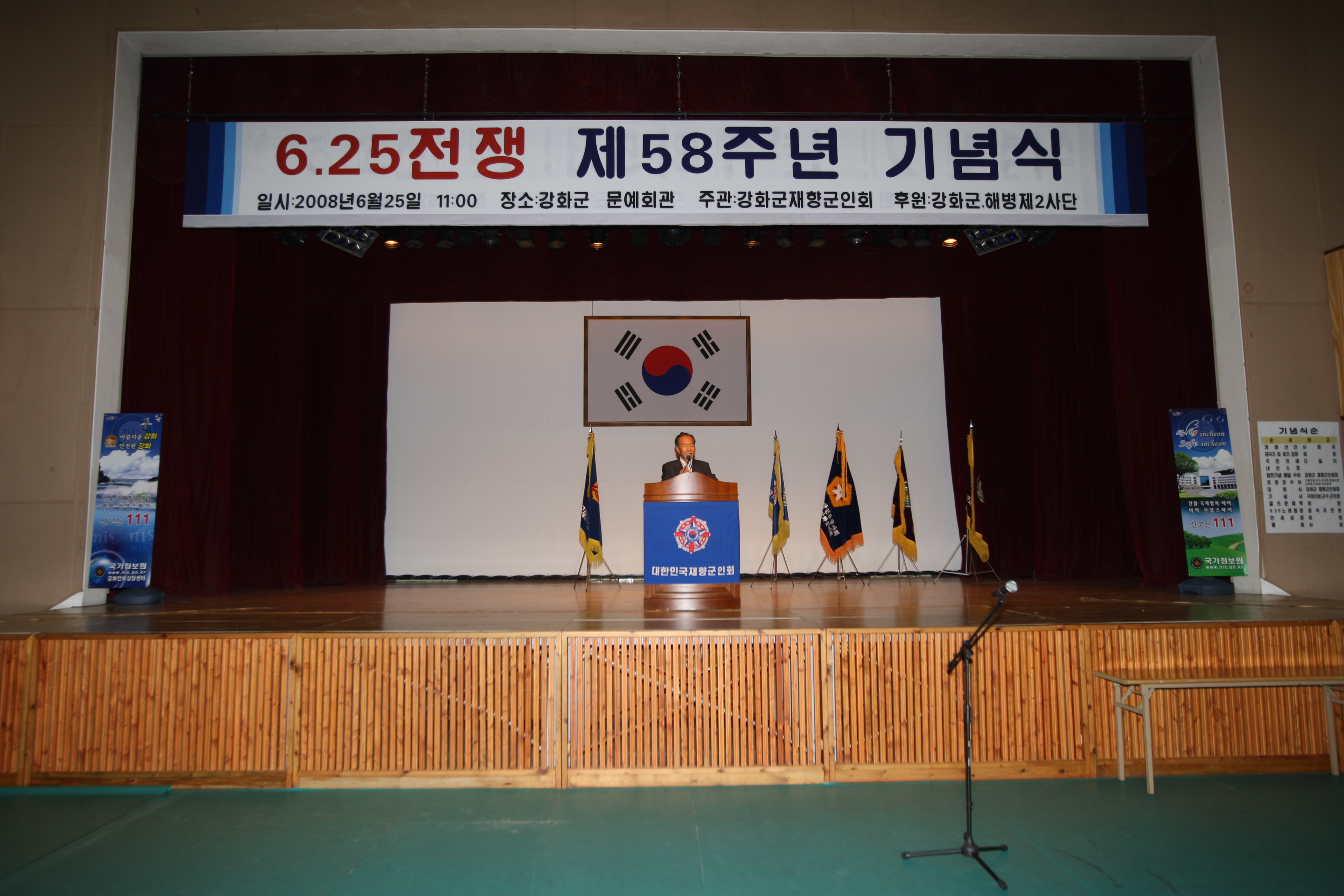 강화군 재향군인회는 25일 강화문예회관 대강당에서 유천호 재향군인회장, 안덕수 강화군수, 이경재 국회의원, 이상설 의회 의장 및 군의원, 각급기관단체장, 재향군인회원 등 700여명이 참석한 가운데 6.25전쟁 제58주년 기념식을 가졌다.