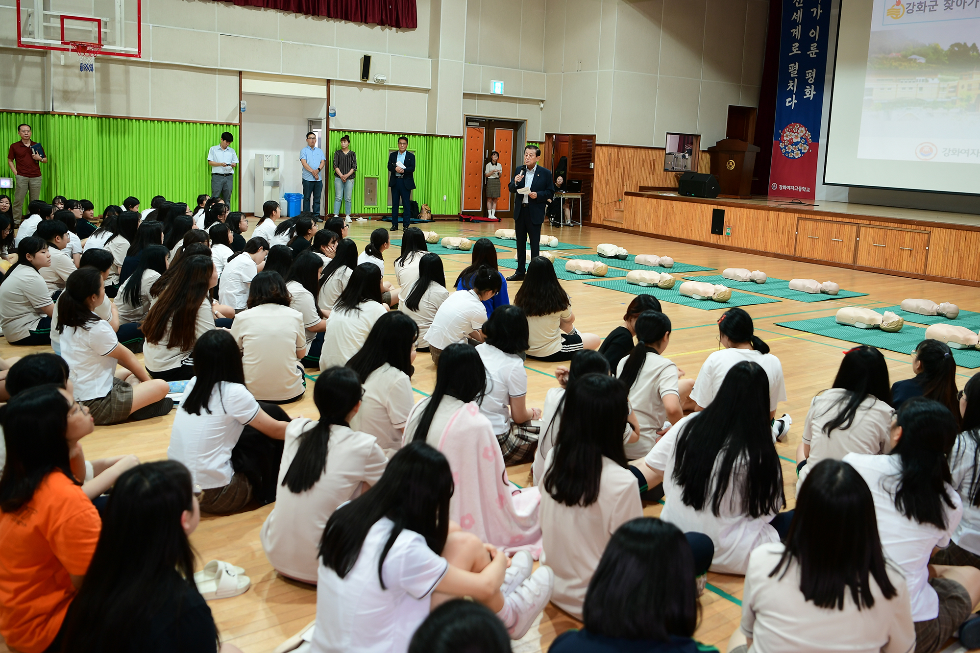 군은 지난 26일 강화여자고등학교를 찾아가 2개반 334명을 대상으로 안전민방위 응급처치 교육을 실시했다. 교육은 심폐소생술에 대한 이론과 실습을 병행함으로써 학생들의 적극적인 참여를 이끌어 냈다.