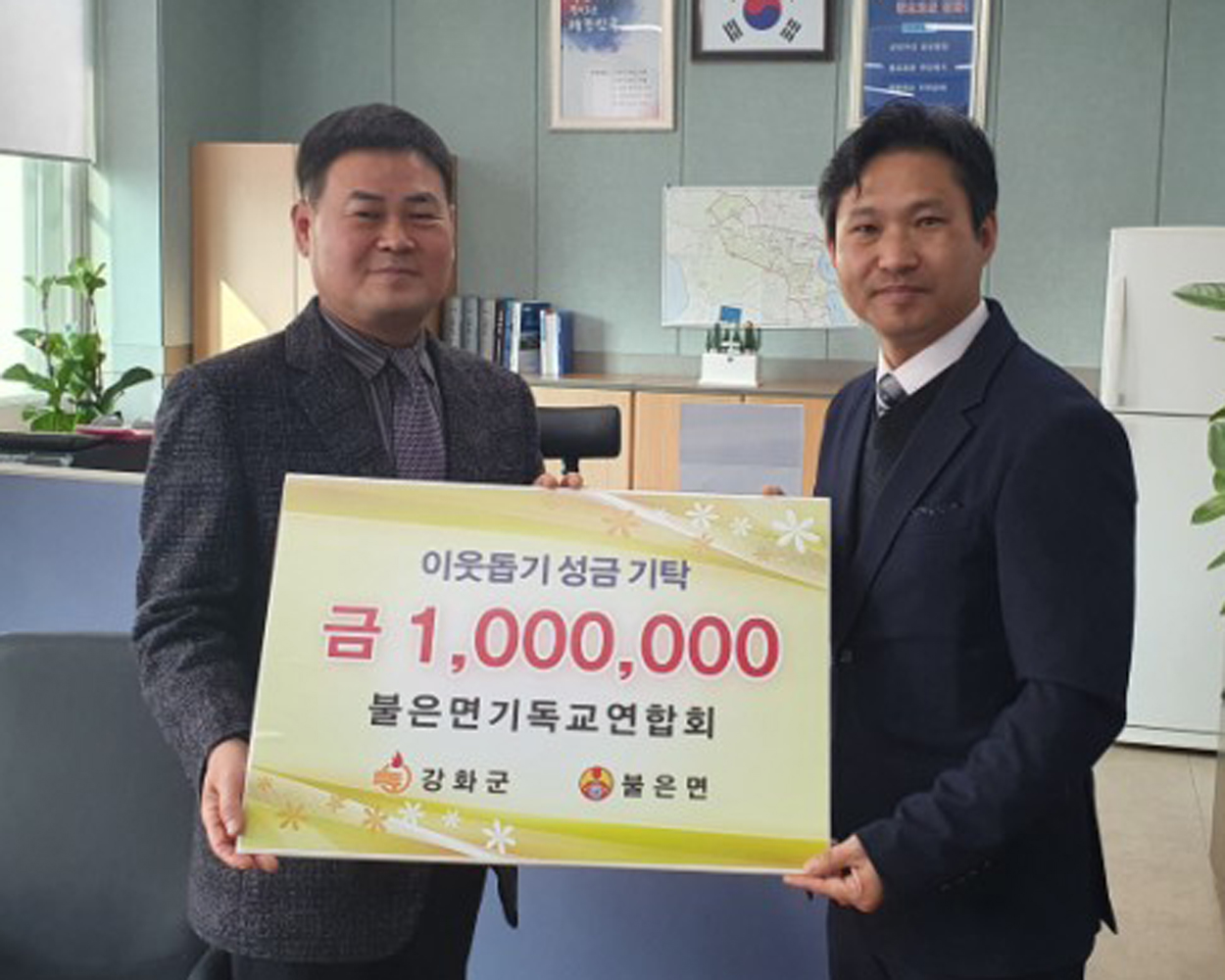 강화군 불은면기독교연합회(대표 이영민 목사)가 지난 23일 불은면사무소에서 이웃돕기를 위한 성금 100만 원을 기탁하며 온정을 전했다.