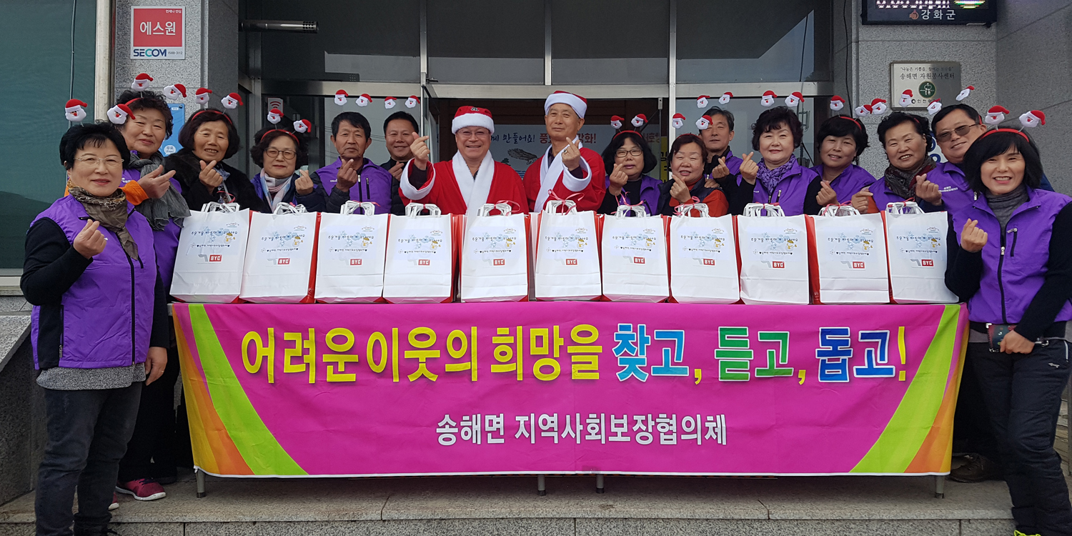 강화군 송해면 지역사회보장협의체(위원장 이군희·이효승)는 지난 23일 연말연시·크리스마스를 맞아 산타로 변신해 관내 취약계층 60가구에 크리스마스 선물로 방한용품을 전달했다.