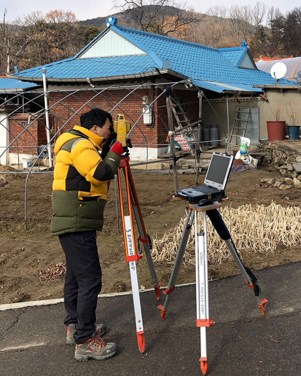 (사진 2매) 1. 군 관계자가 지적측량을 하고 있다