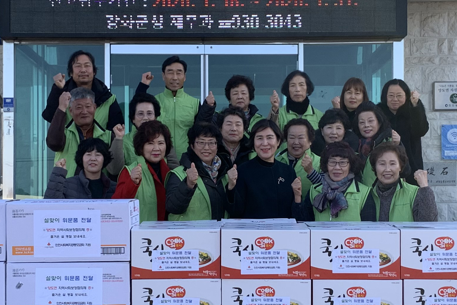강화군 양도면 지역사회보장협의체(위원장 유진식)는 설 명절을 맞아 지난 20일 어려운 이웃 80가정에 쌀국수와 김세트를 전달하며 이웃사랑을 실천했다.