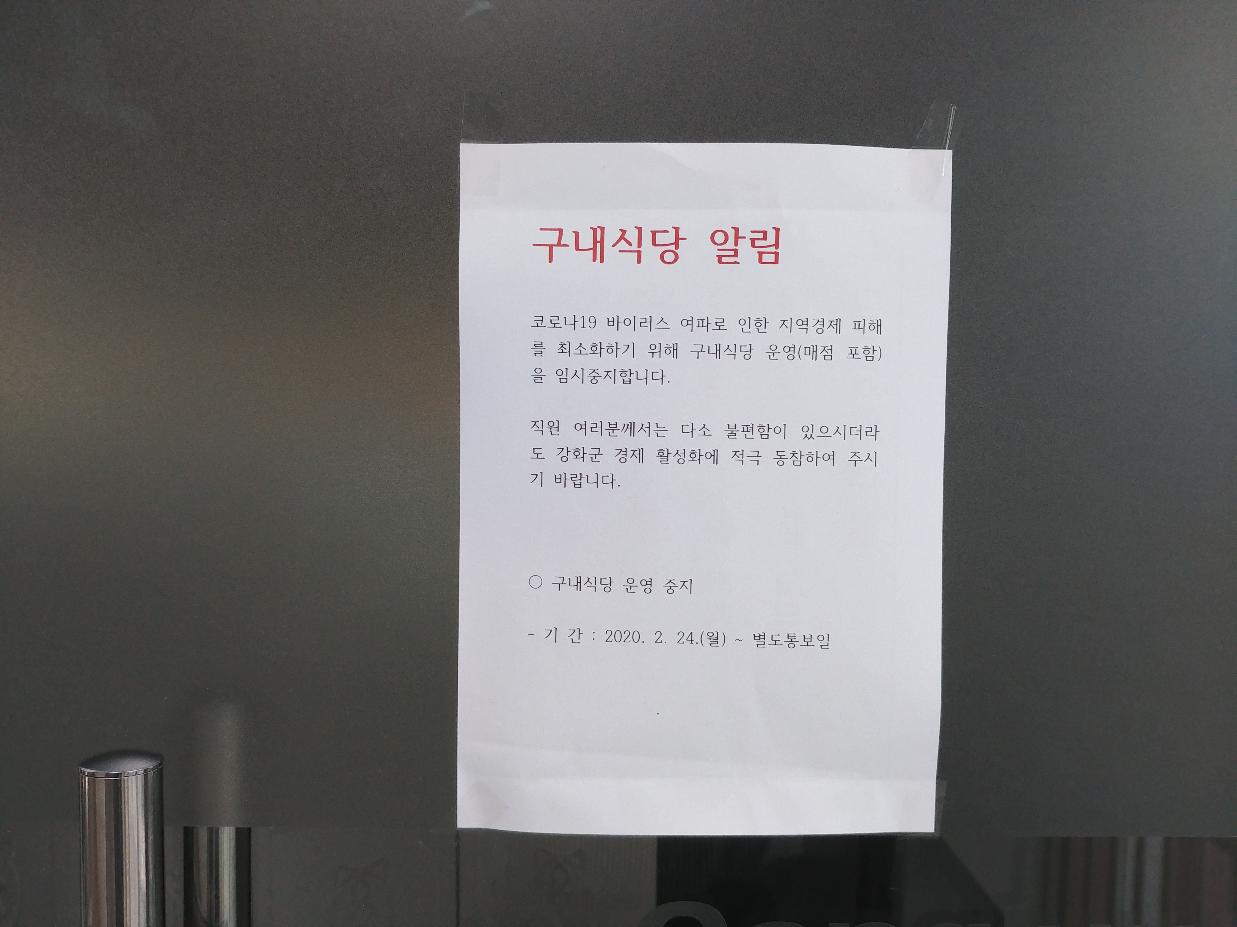 강화군(군수 유천호)은 최근 코로나19 확산으로 어려움을 겪고 있는 관내 외식업계를 돕기 위해 구내식당 운영을 전면적으로 잠정 중단한다고 25일 밝혔다.