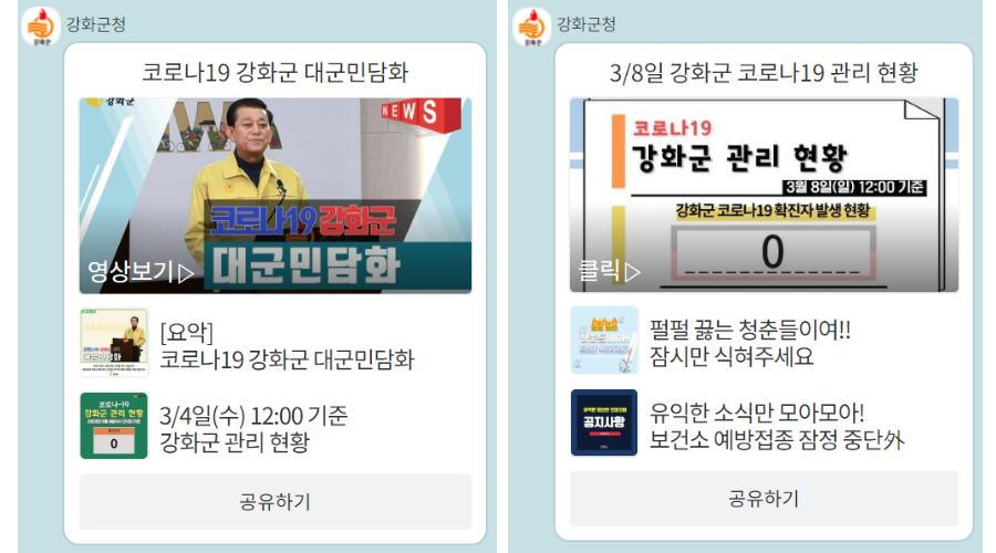 한 구독자는 “코로나19와 관련 불안했는데, 카카오톡 채널을 통해 강화군에서 신속하고 투명하게 정보를 전달해 줘 불안감을 떨쳐낼 수 있었다”며 “이전엔 느끼지 못하고 지냈는데 막상 재난상황이 되니 공무원의 노고와 소중함을 알게 되었다”고 말했다.