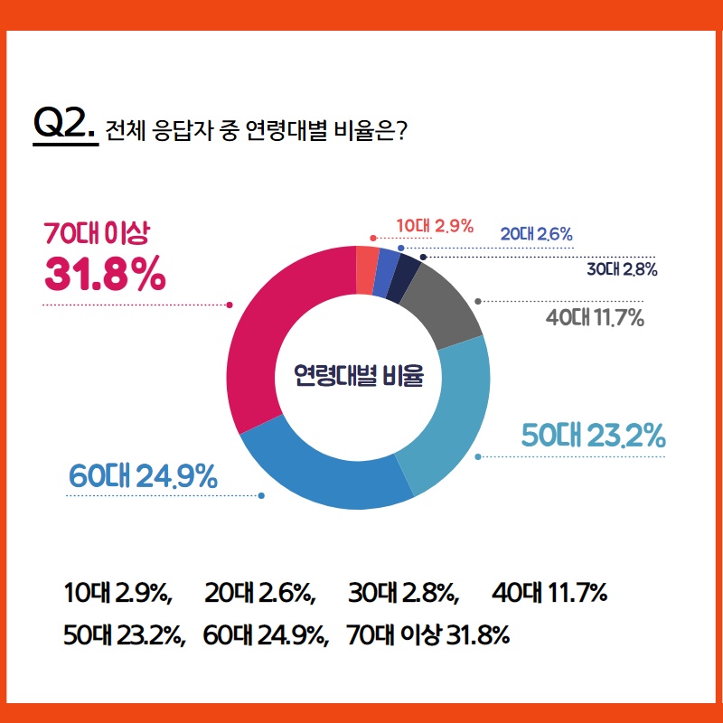 전체 응답자 중 연령대별 비율은 10대가 2.9%, 20대가 2.6%, 30대가 2.8%, 40대가 11.7%, 50대가 23.2%, 60대가 24.9%, 70세 이상이 31.8%를 차지했다.