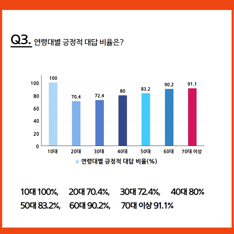 긍정적 대답 비율은 연령대별로는 10대가 100%, 20대가 70.4%, 30대가 72.4%,40대가 80.0%, 50대가 83.2%, 60대가 90.2%, 70세 이상이 91.1%였고, 직업군별로는 농업인이 94.1%, 자영업이 84.5%, 회사원ㆍ근로자가 81%, 기타 직업이 85.2%로 나타났다.