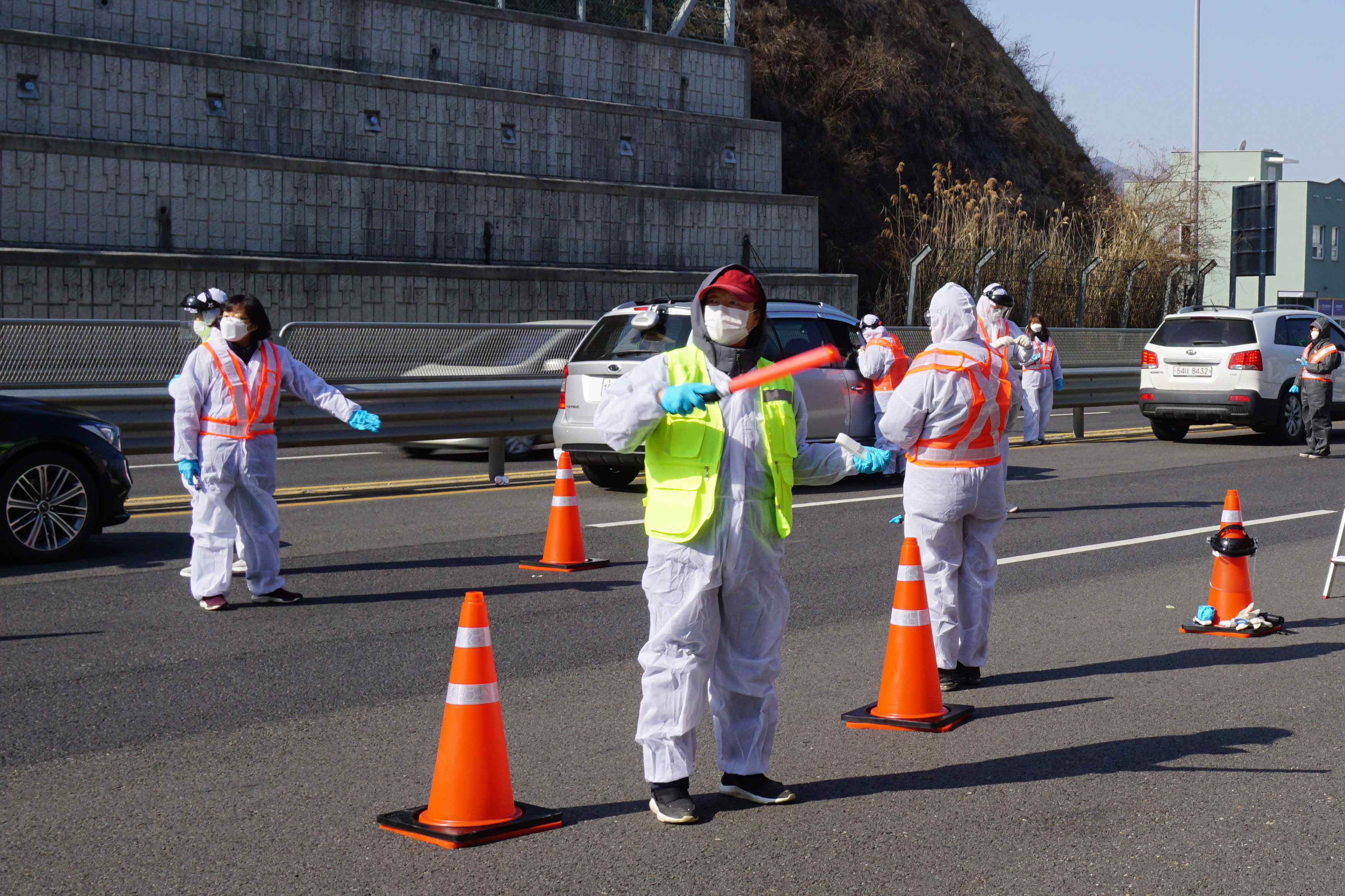 자원봉사자가 교통유도를 하고 있다.