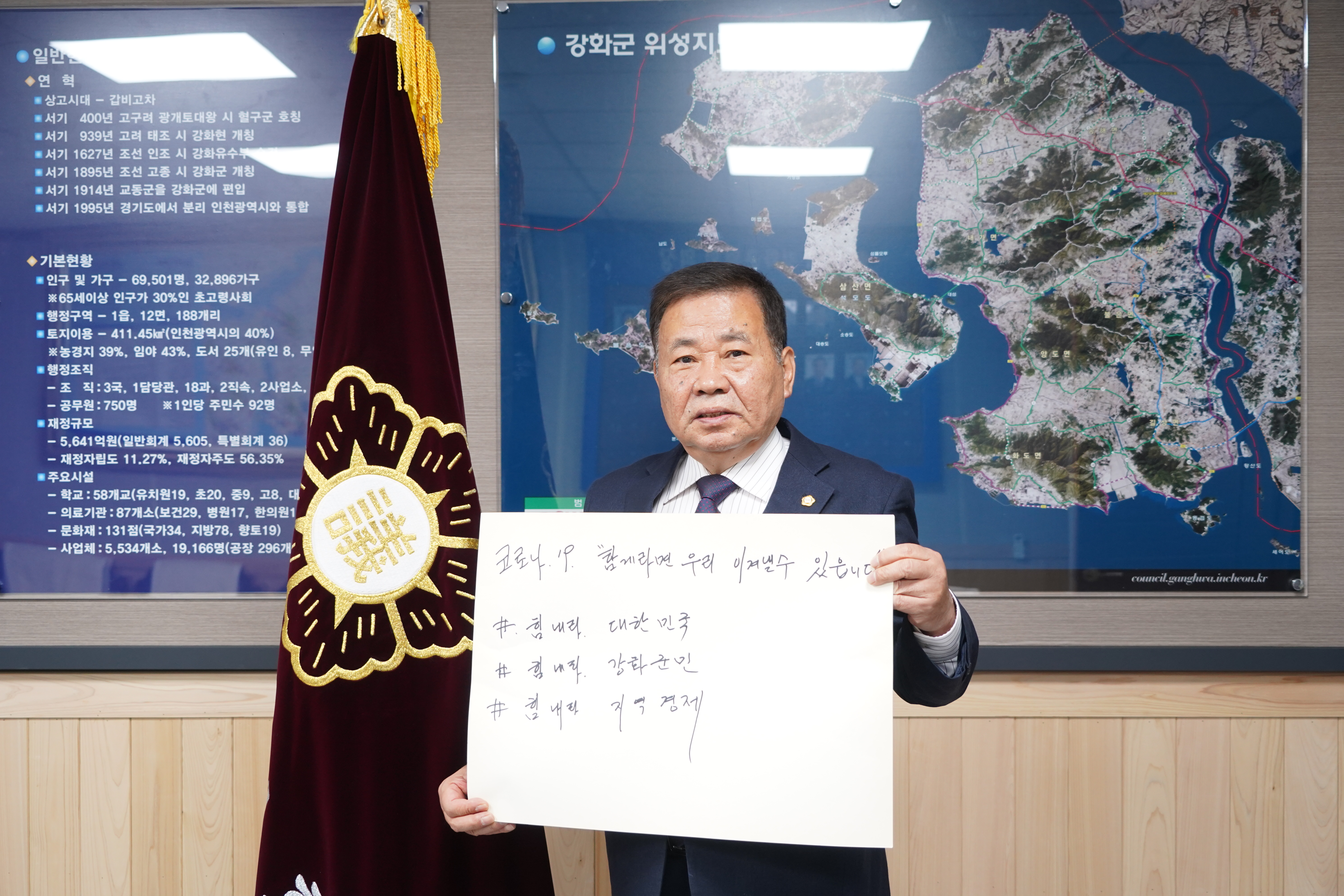 강화군의회 신득상 의장이 ‘코로나19 극복을 위한 희망캠페인 릴레이’에 참여해 대국민 응원 메시지를 전달했다.