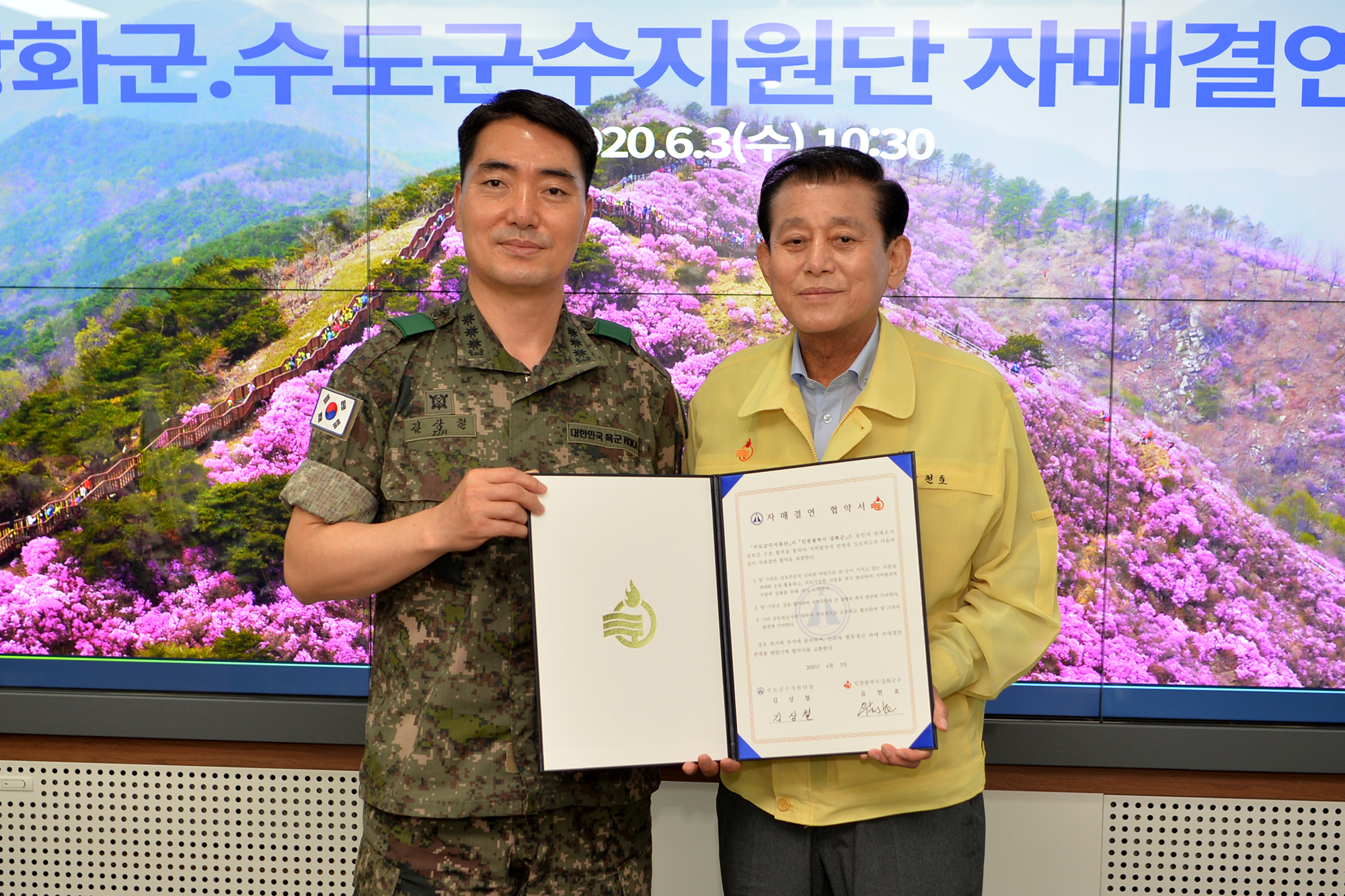 강화군(군수 유천호)과 육군 수도군수지원단(단장 김상철 대령)은 3일 강화군청 군수실에서 동반자 관계로 지역발전과 번영을 도모하고 우호 협력을 위해 자매의 연을 맺었다.