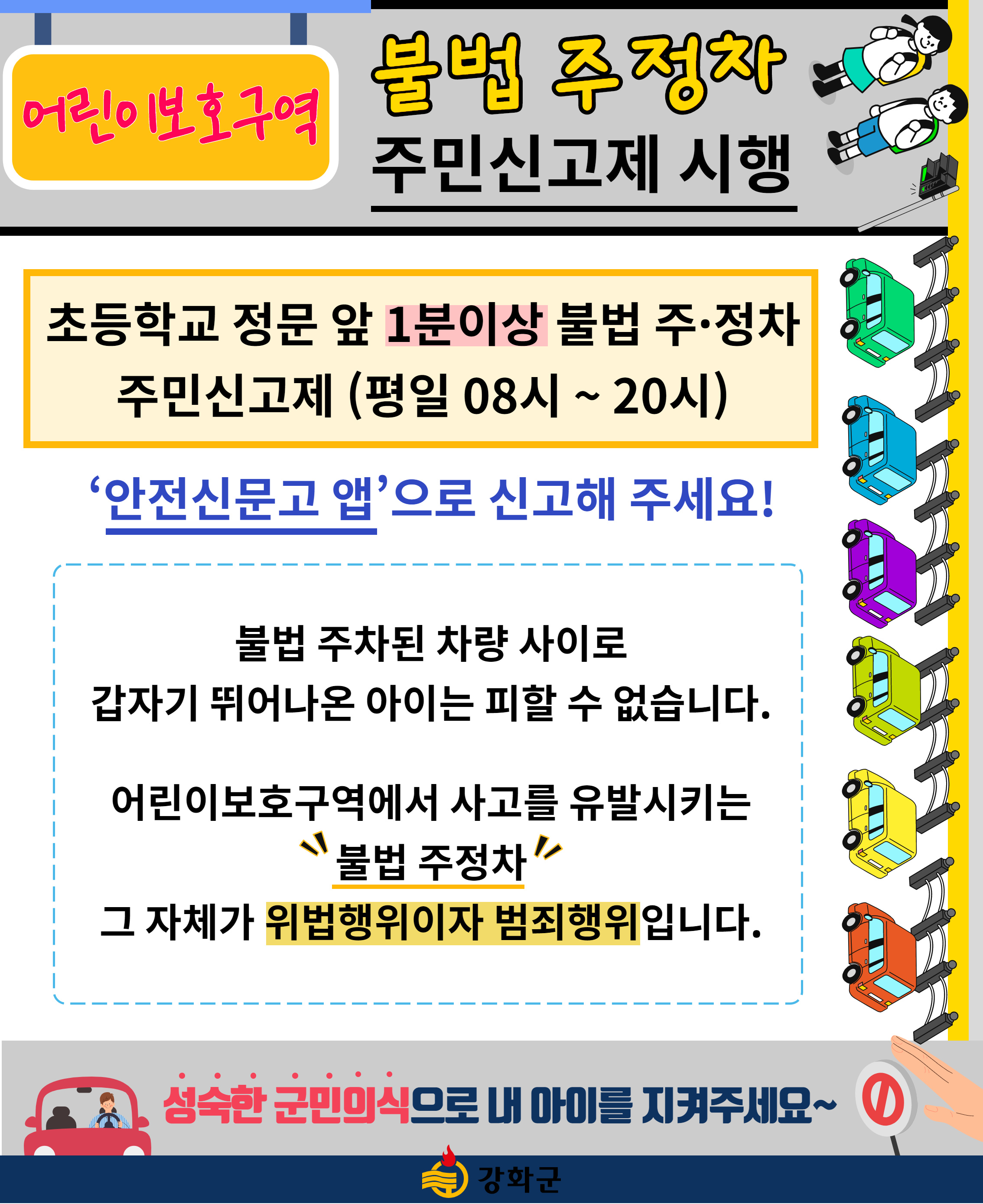 강화군(군수 유천호)은 초등학교 정문 앞 불법 주정차로 인한 안전사고 예방을 위해 ‘어린이보호구역 내 불법 주·정차 주민신고제’를 시행한다고 15일 밝혔다.