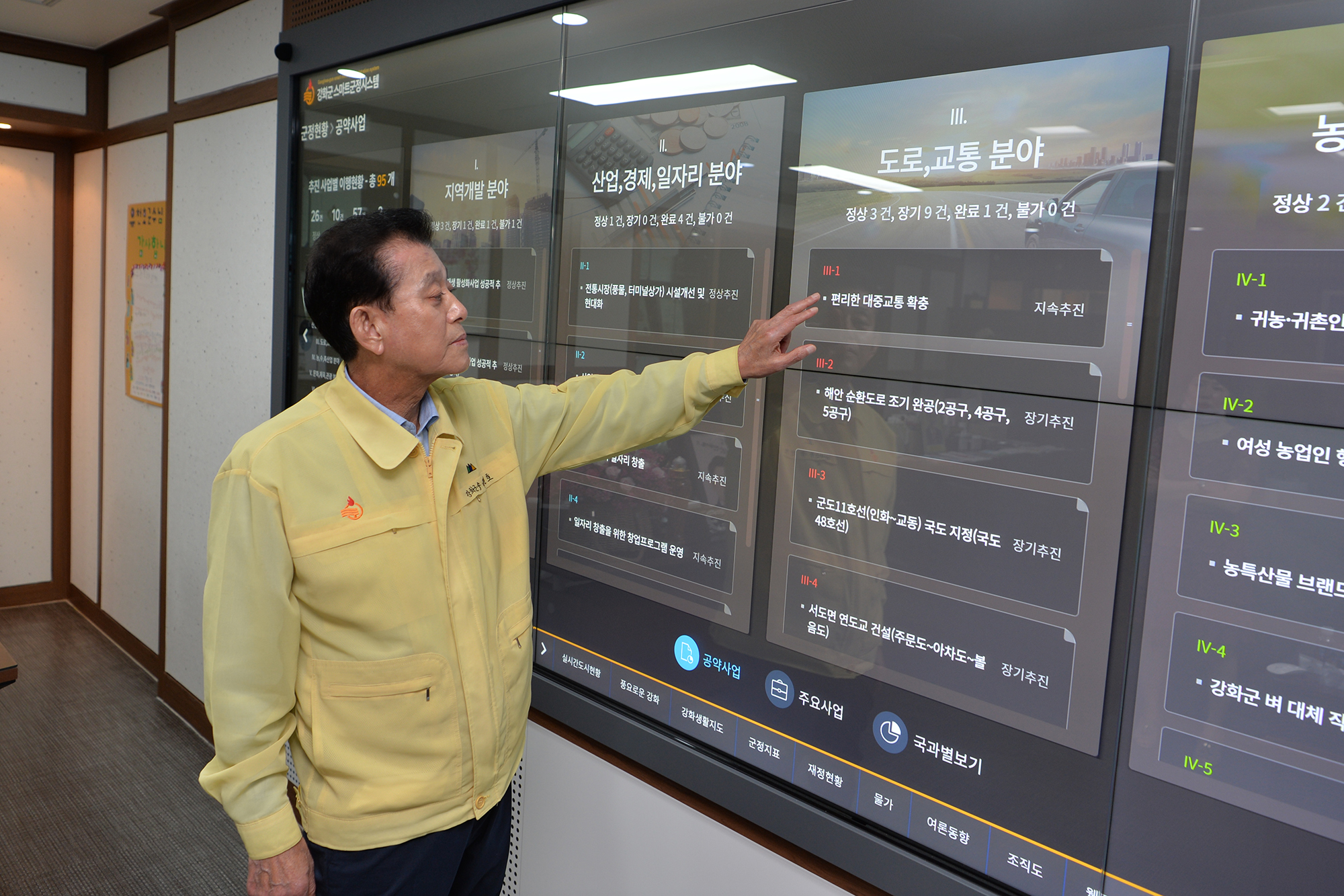 군수집무실에 설치된 대형 디지털 현황판을 통해 ▲군정지표 ▲주요 추진 사업현황 ▲재정 ▲민원 ▲재난(화재, 교통사고 등) ▲환경(미세먼지, 기상 등) ▲물가 정보 등을 한눈에 볼 수 있고, 문제가 발생하면 즉시 파악해 신속하게 정책 결정을 할 수 있게 된다. 또한, 주민의 불편 및 요구 사항을 빠르게 파악해 군민 맞춤형 정책 개발에 일조할 것으로 기대된다.