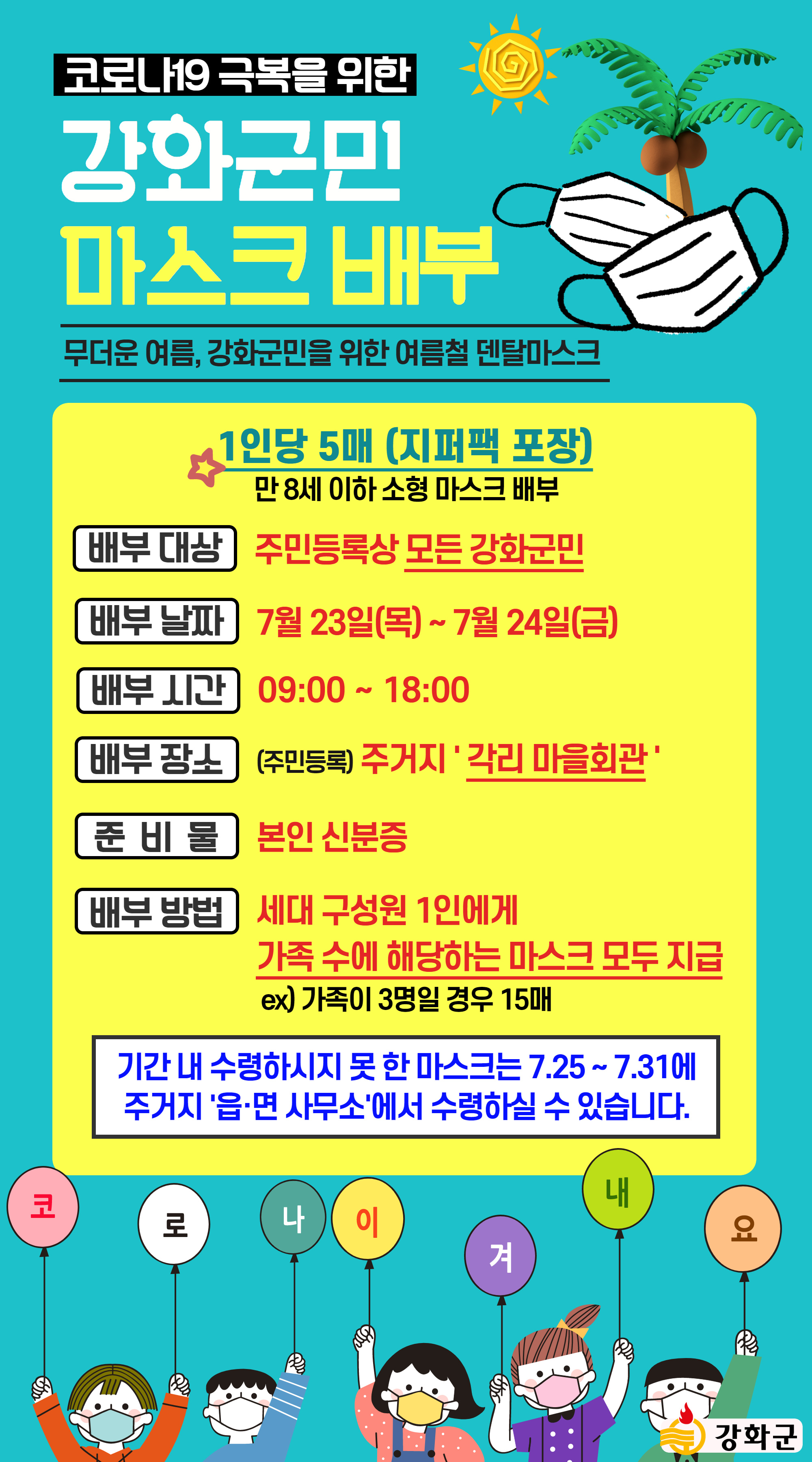 이번에 배부하는 덴탈 마스크는 무더운 여름철 숨쉬기 편한 3중 필터 마스크다. 군은 마스크 35만 장을 확보해 군민 1인당 5매씩 배부한다.