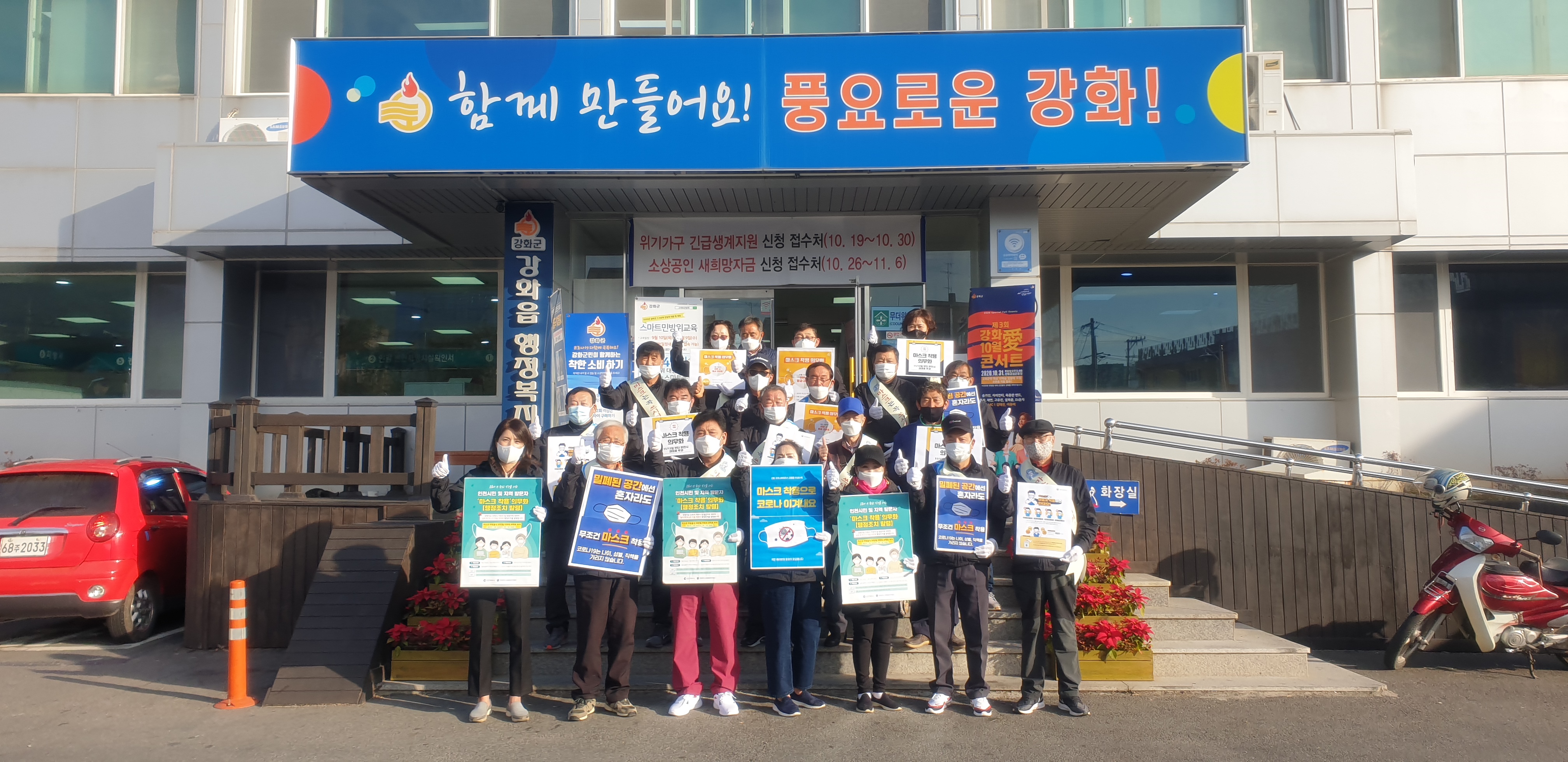 쌀쌀해진 날씨에도 불구하고 아침 일찍부터 강화읍 이장단 29명이 참여한 이번 캠페인에서는 코로나19 예방을 위한 주민들의 마스크 의무 착용을 독려하고 올바른 마스크 착용법을 홍보했다.