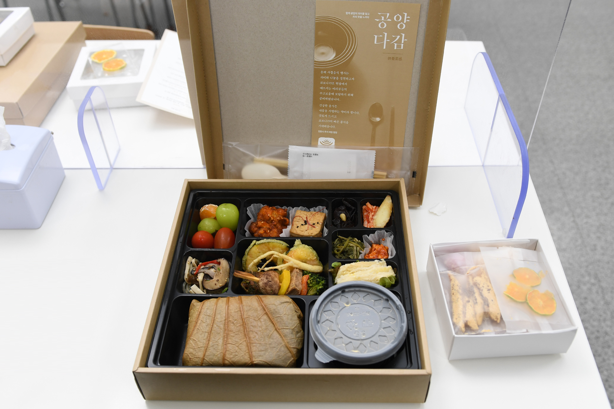 사찰음식 도시락에는 공양다감(공양의 참된 의미를 알고 차의 맛을 느끼다)의 뜻을 담아, 코로나19 감염 확산으로부터 군민의 안전을 지키기 위해 최일선에서 근무하고 있는 직원들에게 점심 식사로 전달됐다.