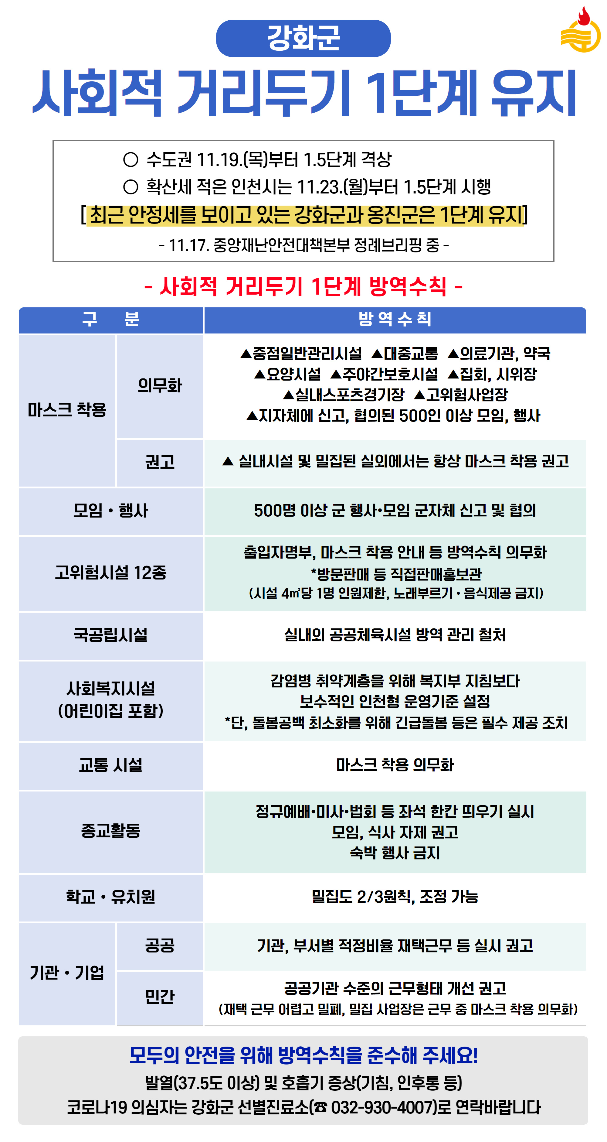 강화군(군수 유천호)은 오는 23일부터 인천광역시의 사회적 거리두기 1.5단계 상향에도 당분간 1단계를 유지한다.