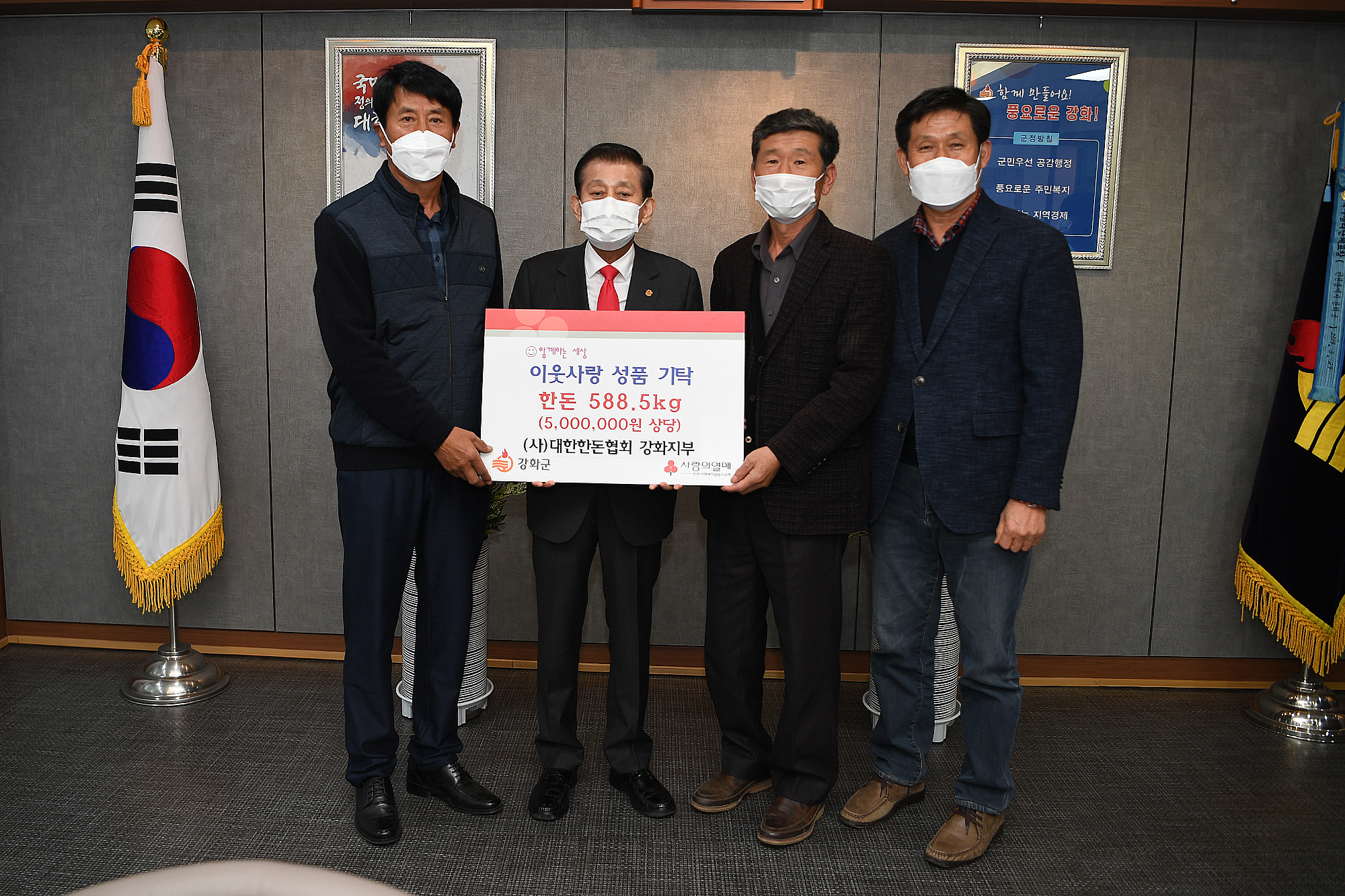 강화군(군수 유천호)은 대한한돈협회 강화군지부(지부장 심공섭)가 지난 24일 코로나19로 어려움을 겪고 있는 이웃들에게 써달라며 5백만 원 상당의 돼지고기 588.5kg를 기탁했다고 밝혔다.