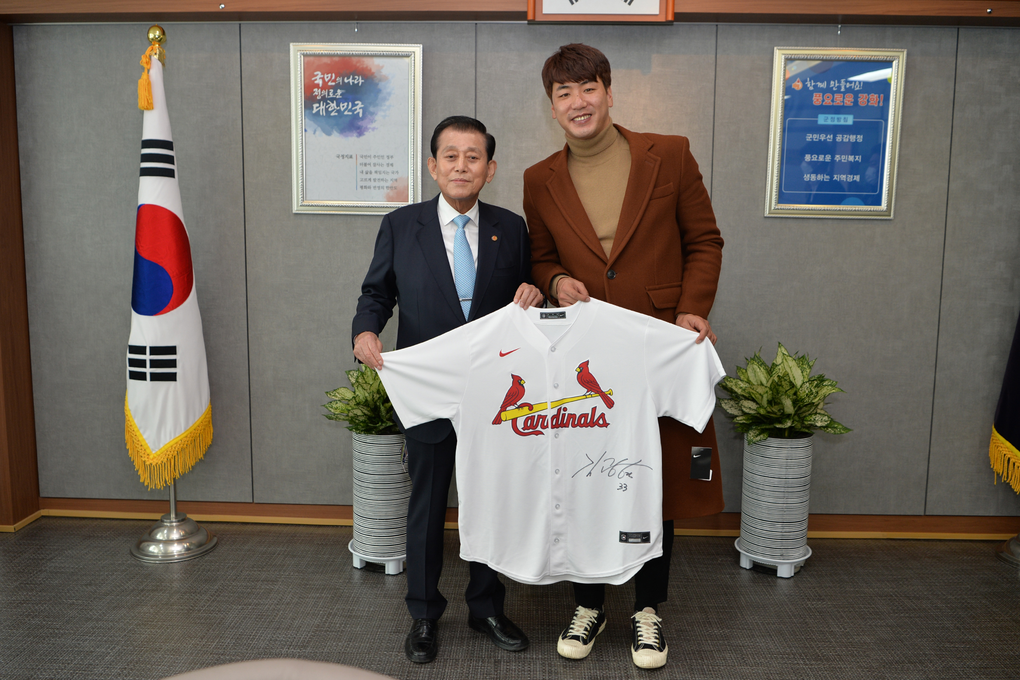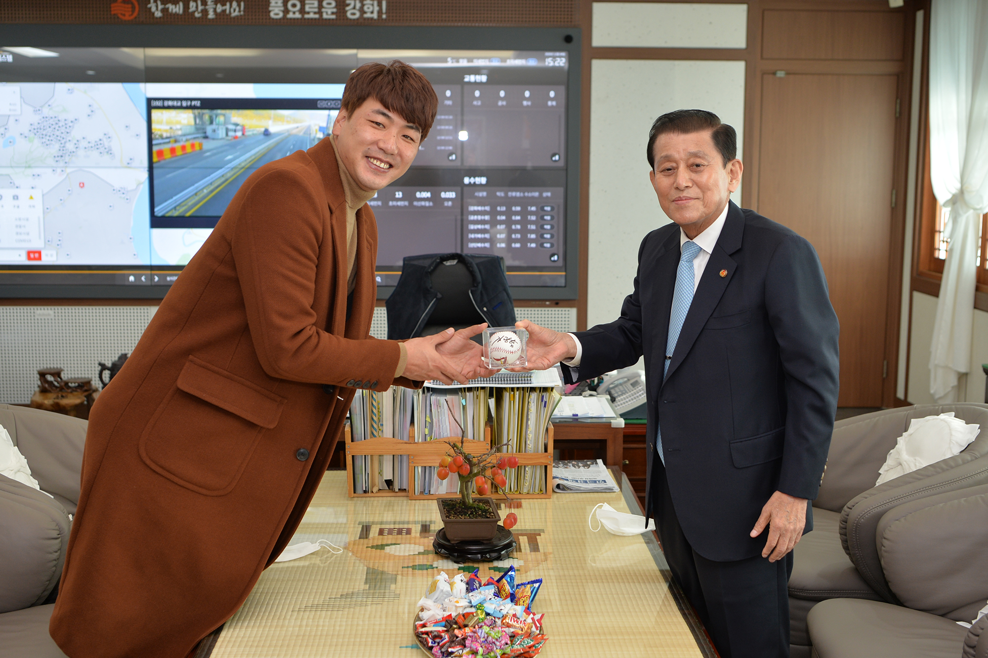 유천호 강화군수가 비시즌을 맞아 지난 4일 강화군을 방문한 메이저리거 김광현(32세, 세이트루이스) 선수를 격려했다.