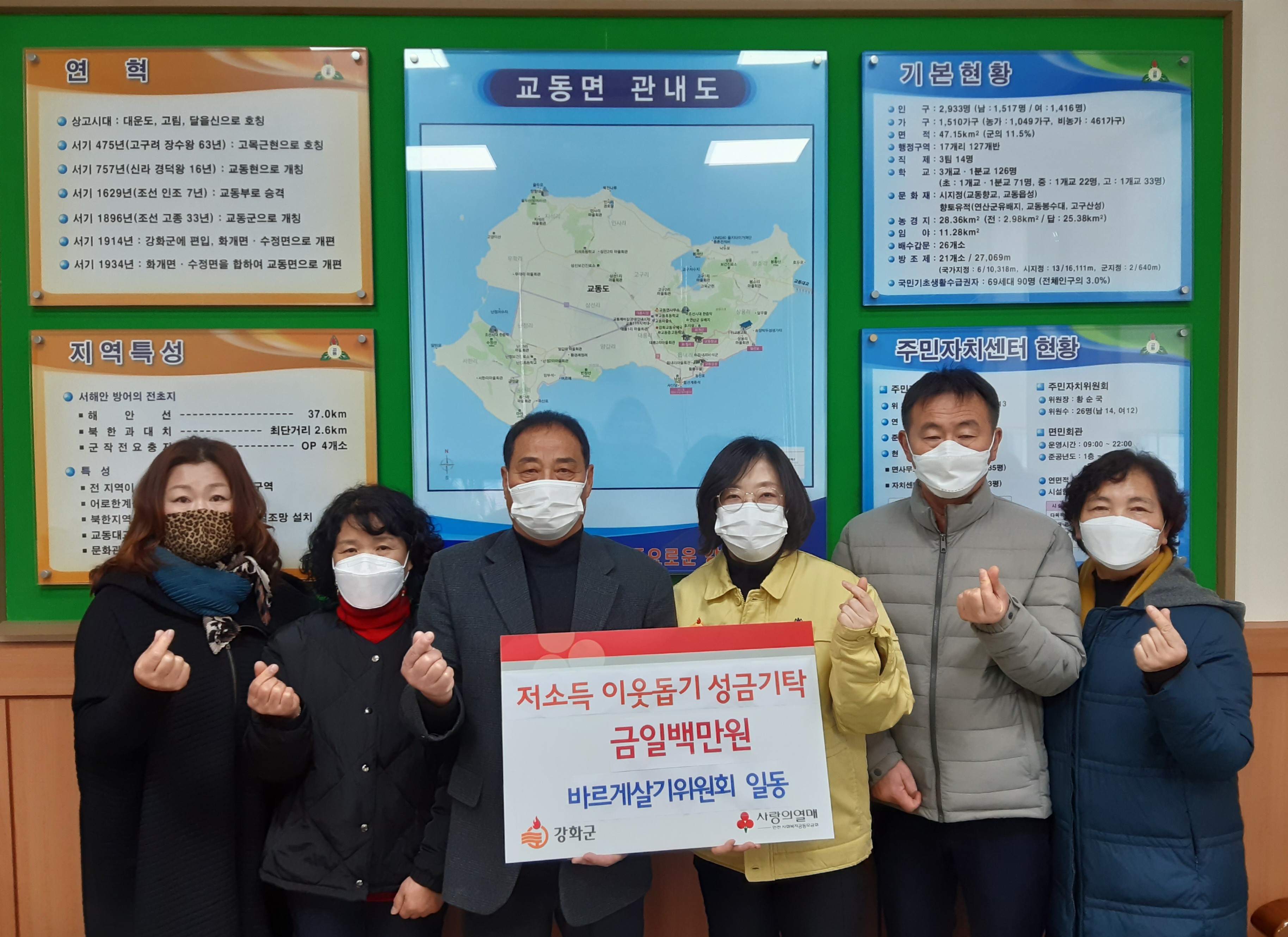 조현미 교동면장은 “어려운 이웃을 꾸준히 발굴해 따뜻한 온정의 손길이 절실히 필요한 곳에 성금이 사용될 수 있도록 하겠다”며 바르게살기위원회의 후원에 뜻깊은 감사를 표했다.