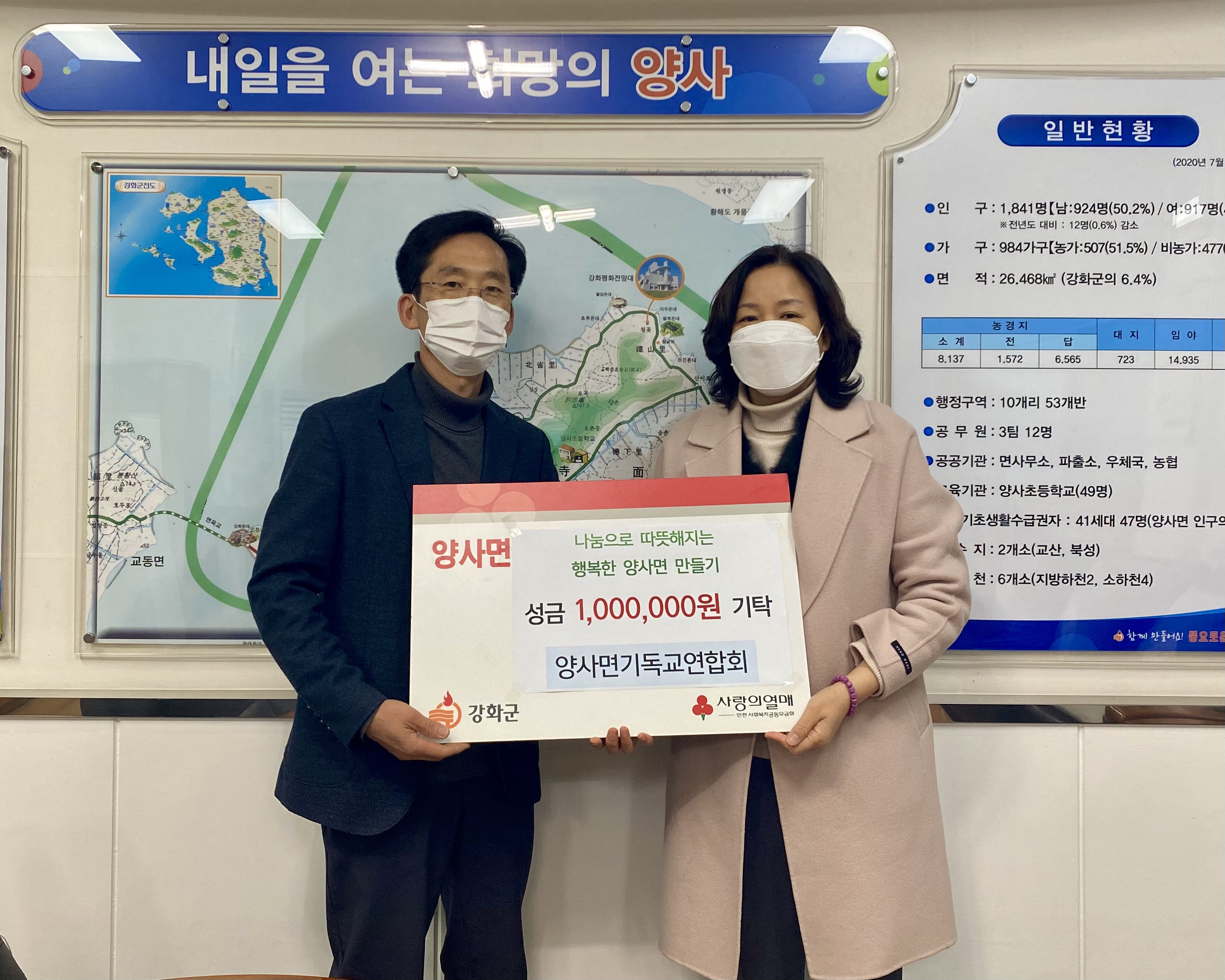 강화군 양사면 기독교 연합회(회장 원충연)에서 코로나 극복을 위한 마음을 모아 성금 100만 원을 양사면에 기탁했다.