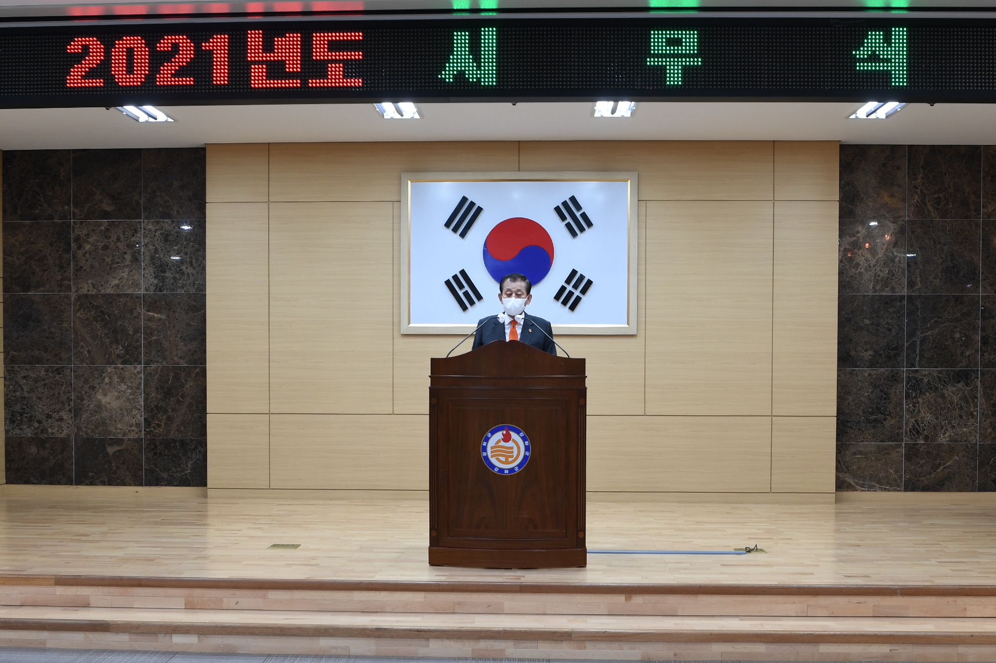 이날 시무식에는 사회적 거리두기 연말연시 특별 방역 강화 대책에 따라 국‧과장 등 소수 인원만 참석했으며, 전 직원은 온라인으로 시청했다.