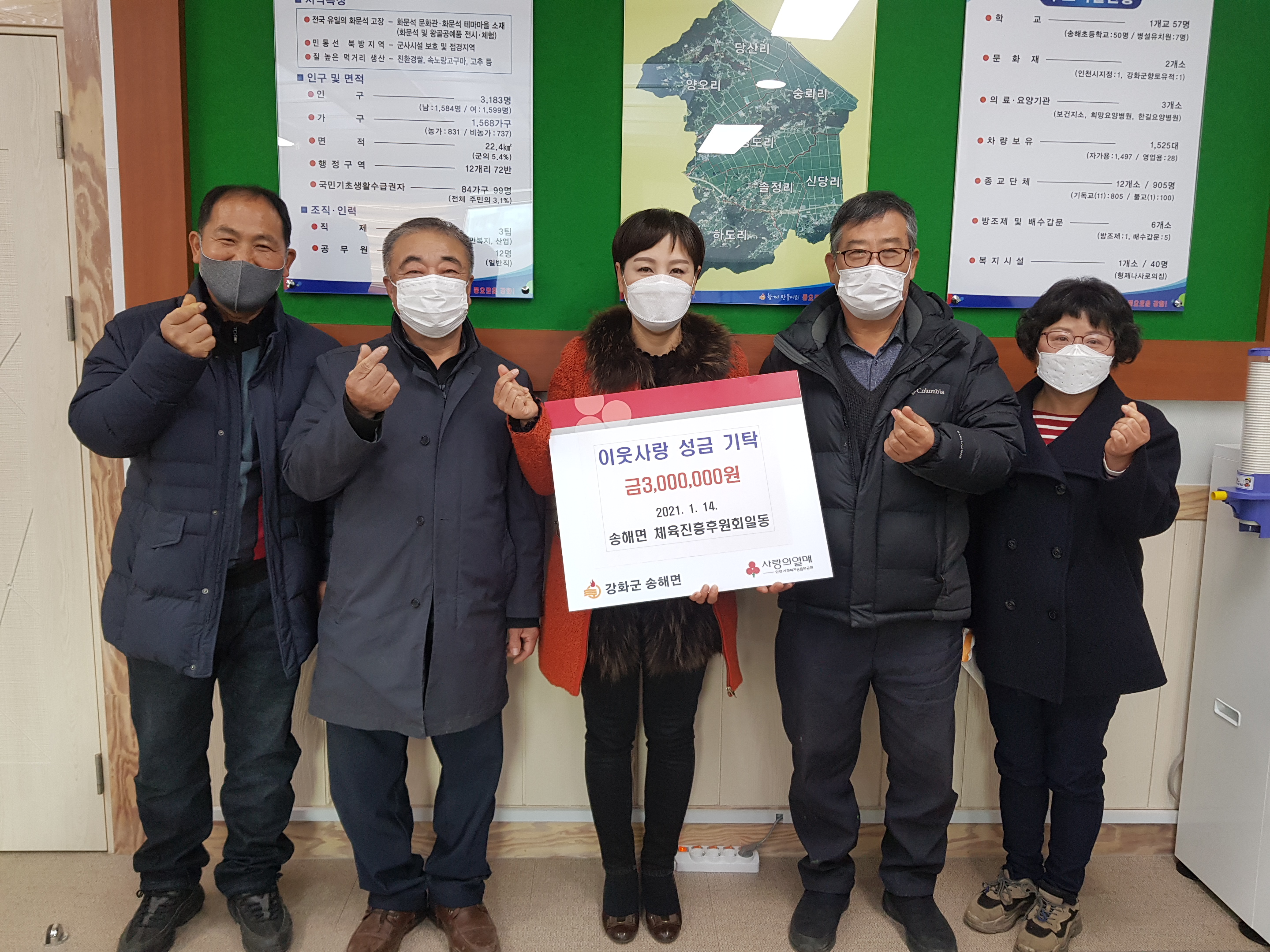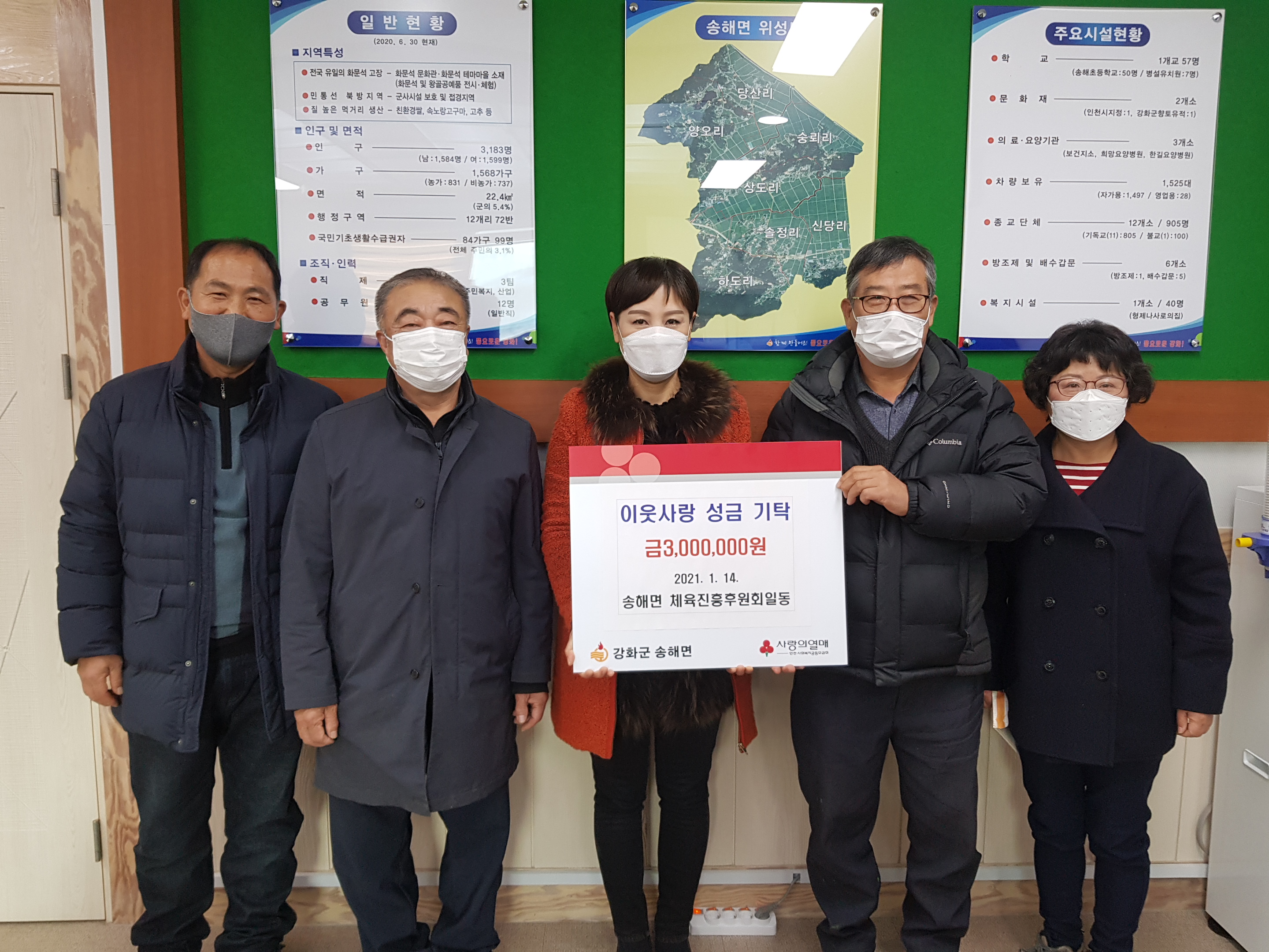 강화군 송해면 체육진흥후원회(회장 장석찬)가 지난 14일 민족 고유의 명절 설을 맞아 코로나19로 어려워하는 이웃을 돕기 위한 성금 300만 원을 송해면에 기탁했다.