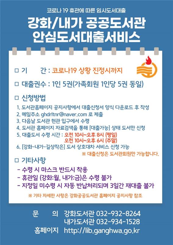 강화도서관, 내가도서관, 길상작은도서관은 ‘비대면 안심 도서대출 서비스’를 통해 이용자가 희망도서를 메일이나 전화로 신청하면 다음날 도서관 현관 입구에서 받아 볼 수 있다. 1인 5권까지 대출받을 수 있고, 무인반납기를 통해 상시 반납도 가능하다.