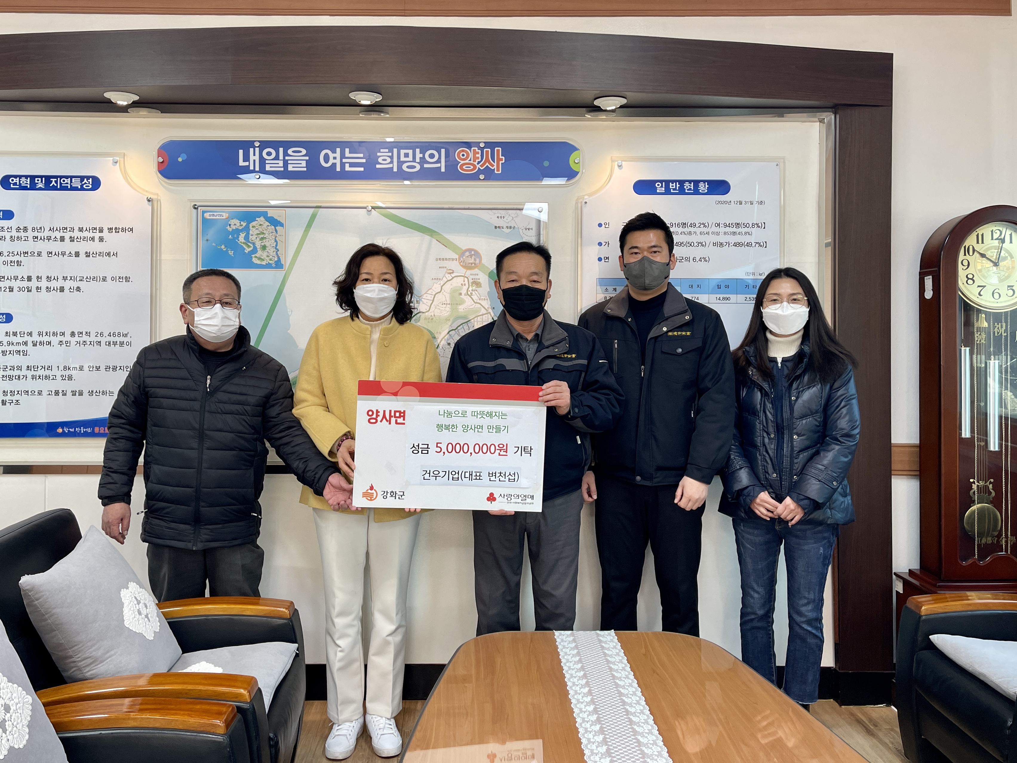 강화군 양사면에 소재한 건우기업(대표 변천섭)은 29일 양사면을 방문해 명절을 맞아 이웃돕기 성금 500만 원을 기탁했다.
