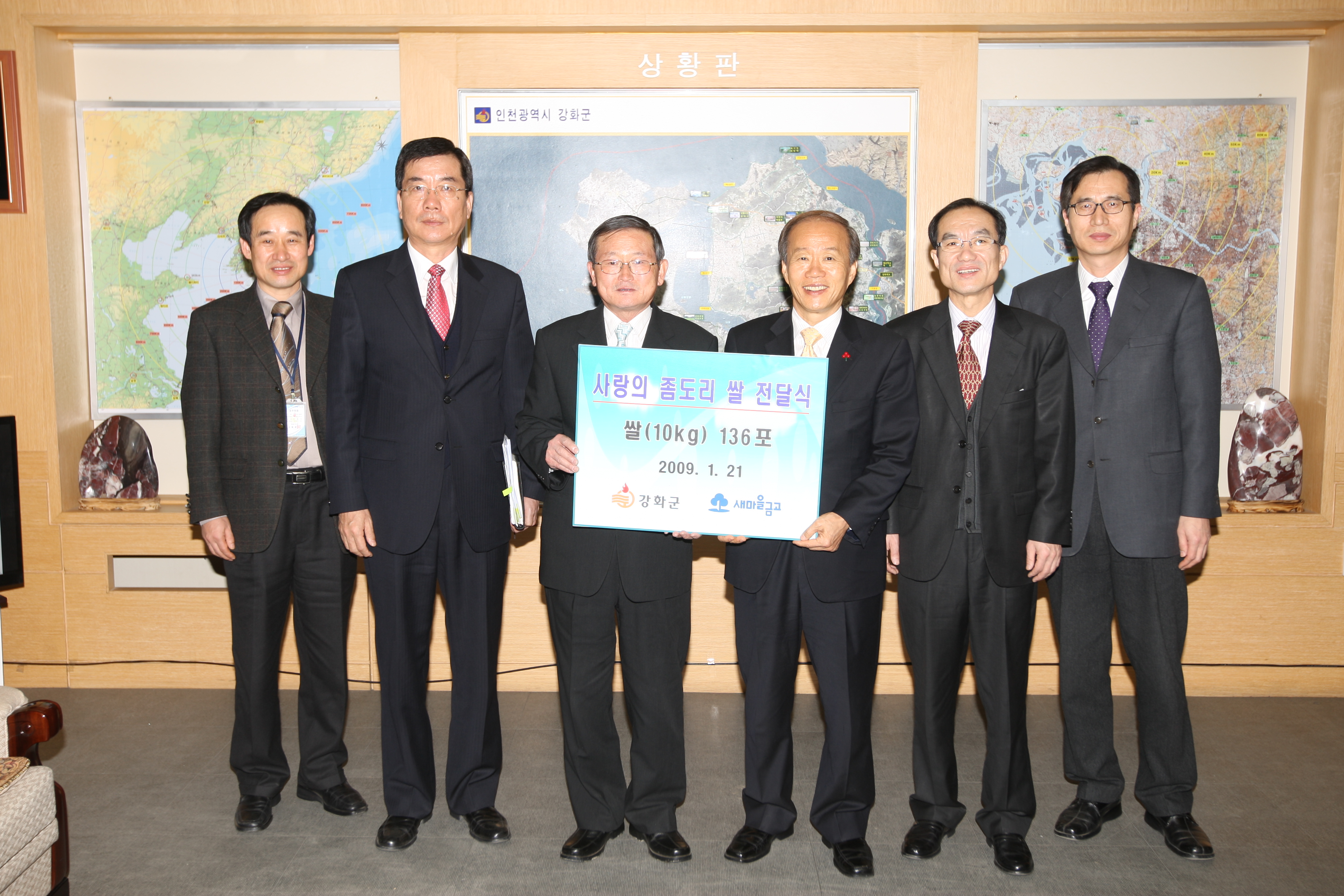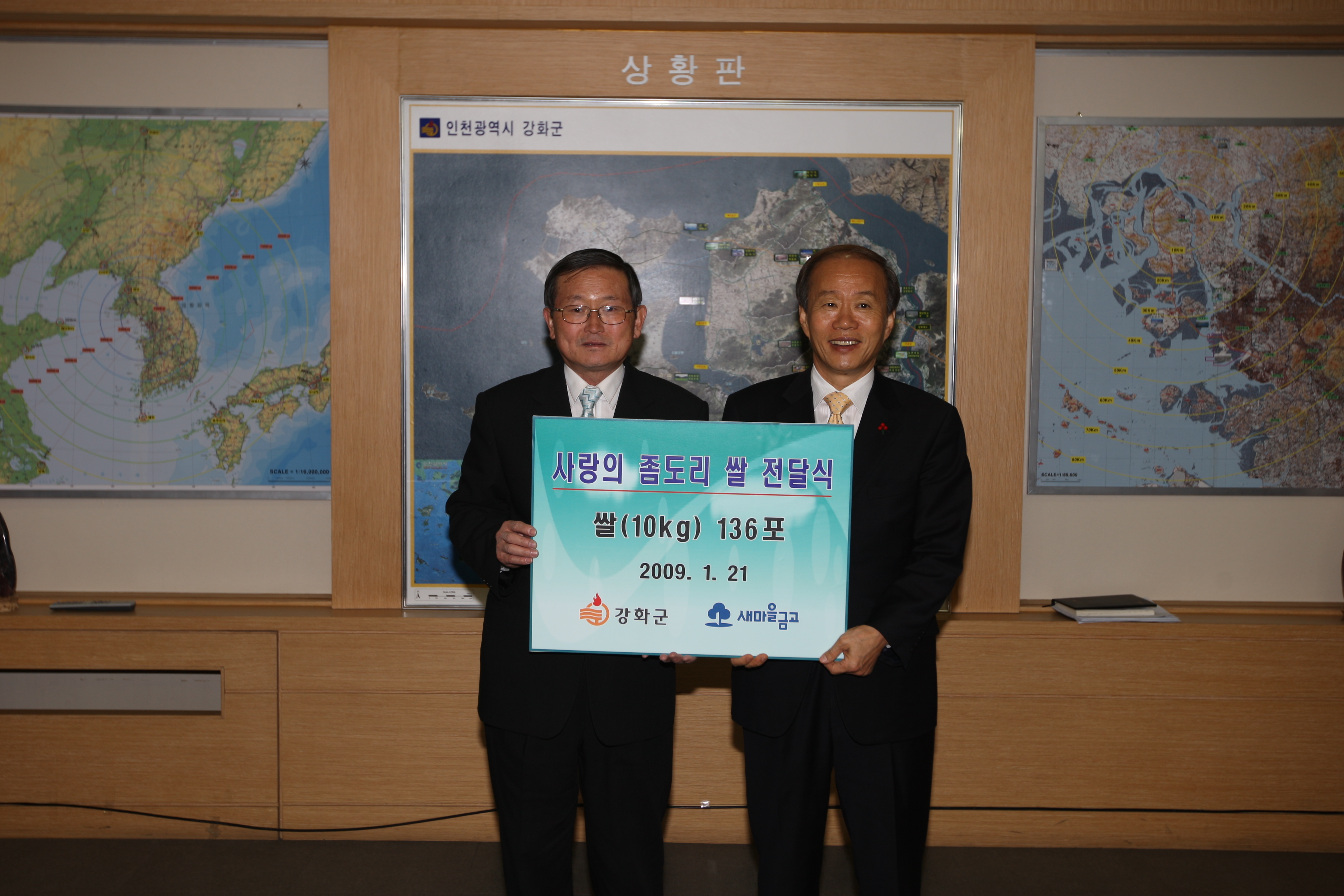 강화군은 21일 군청 2층 영상회의실에서 안덕수 강화군수 및 새마을금고이사장(이사장 장기천) 등이 참석한 가운데 쌀 122포(10kg)에 대한 『2008 사랑의 좀도리 운동 쌀』전달식을 가졌다.