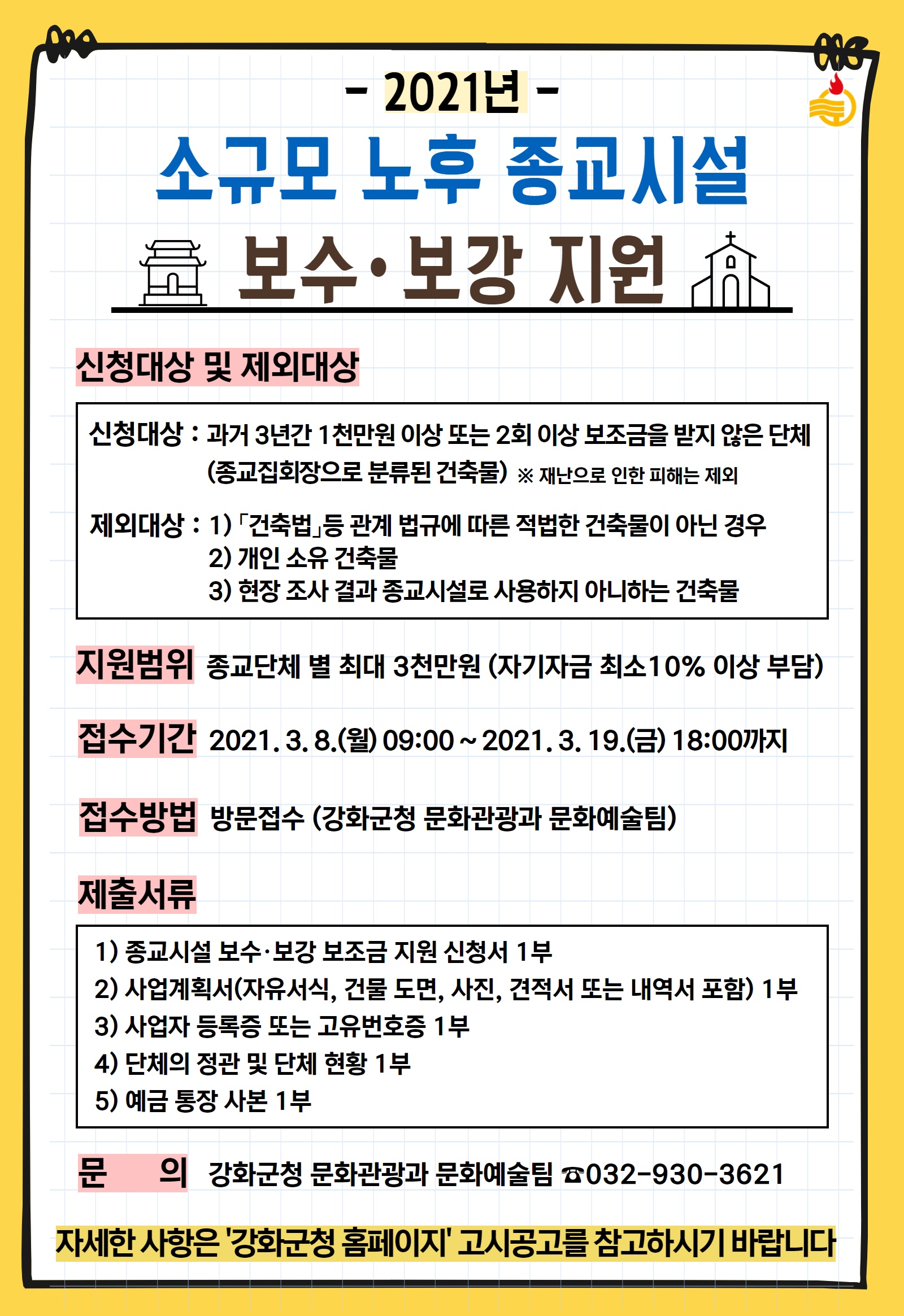 강화군(군수 유천호)은 2021 도 종교단체의 소규모 노후 건축물 보수·보강 지원사업(이하 ‘종교시설 보수지원사업’)을 추진한다고 밝혔다..