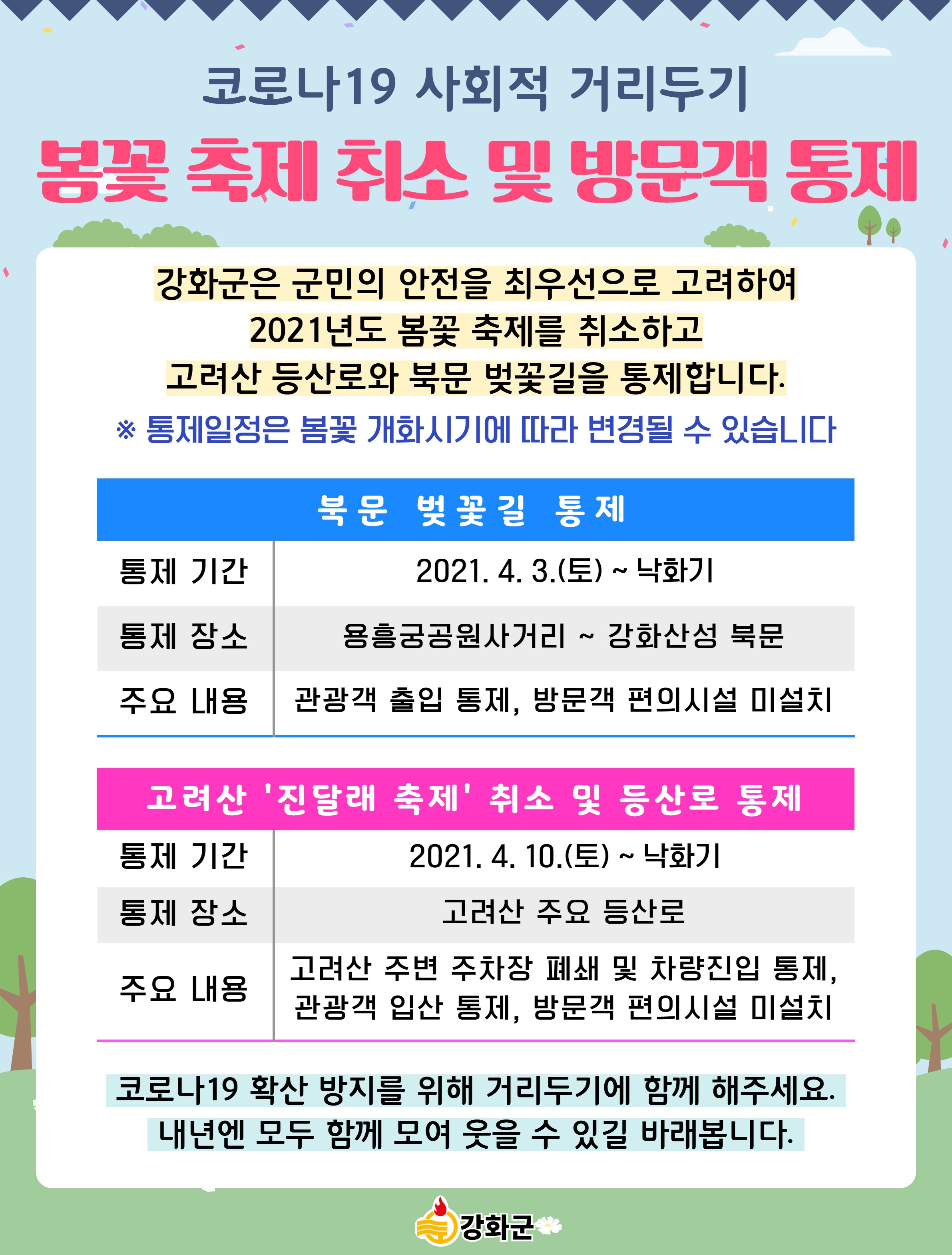강화군(군수 유천호)이 코로나19의 지역사회 유입 차단을 위해 ‘2021년도 고려산 진달래 축제’와 ‘북문 벚꽃길 행사’를 전면 취소하고 등산로 등을 전면 폐쇄한다.