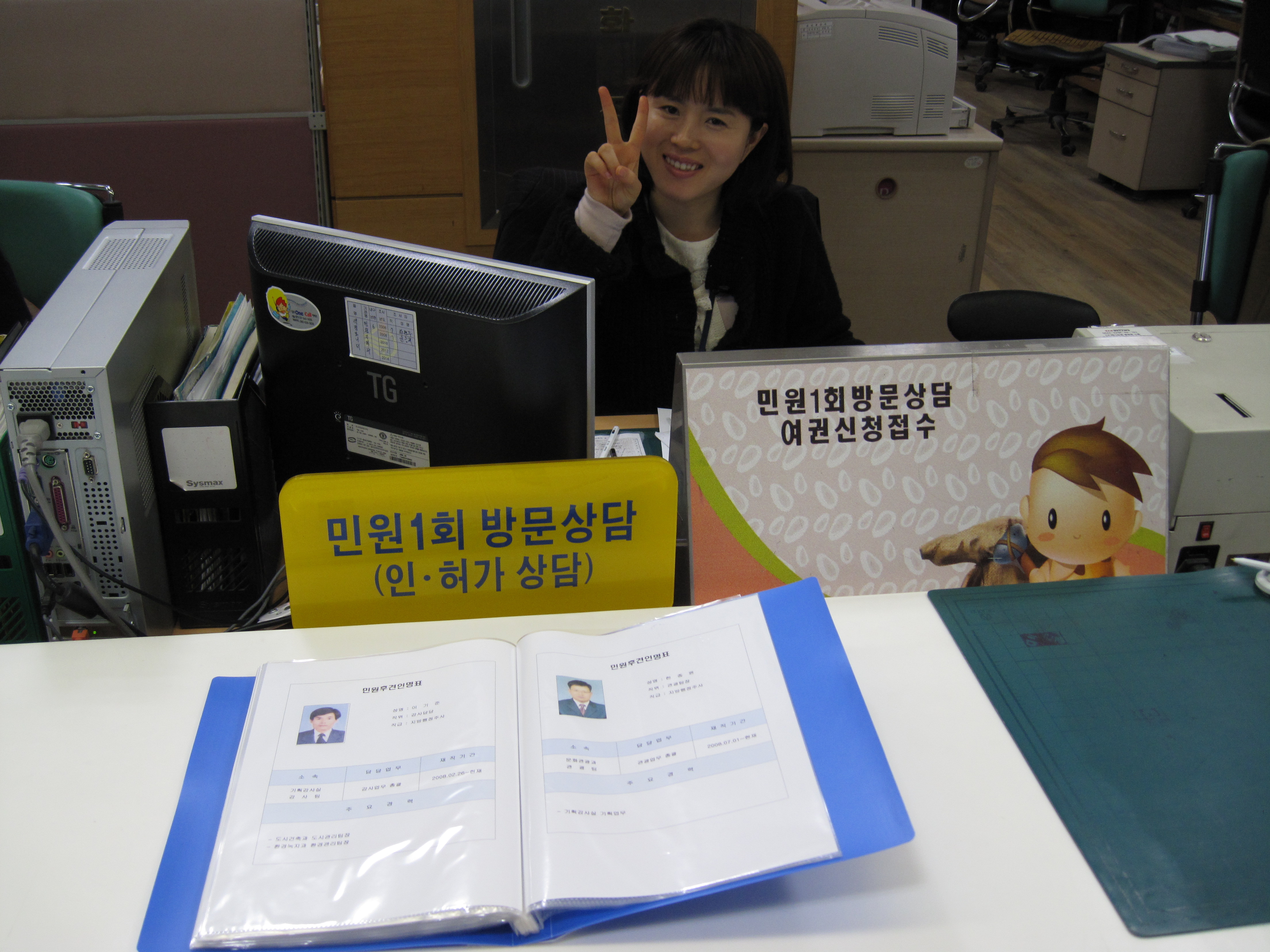(사진설명 : 강화군청 민원접수창구에서 친절하게 민원인을 맞이하는 장애경씨 )