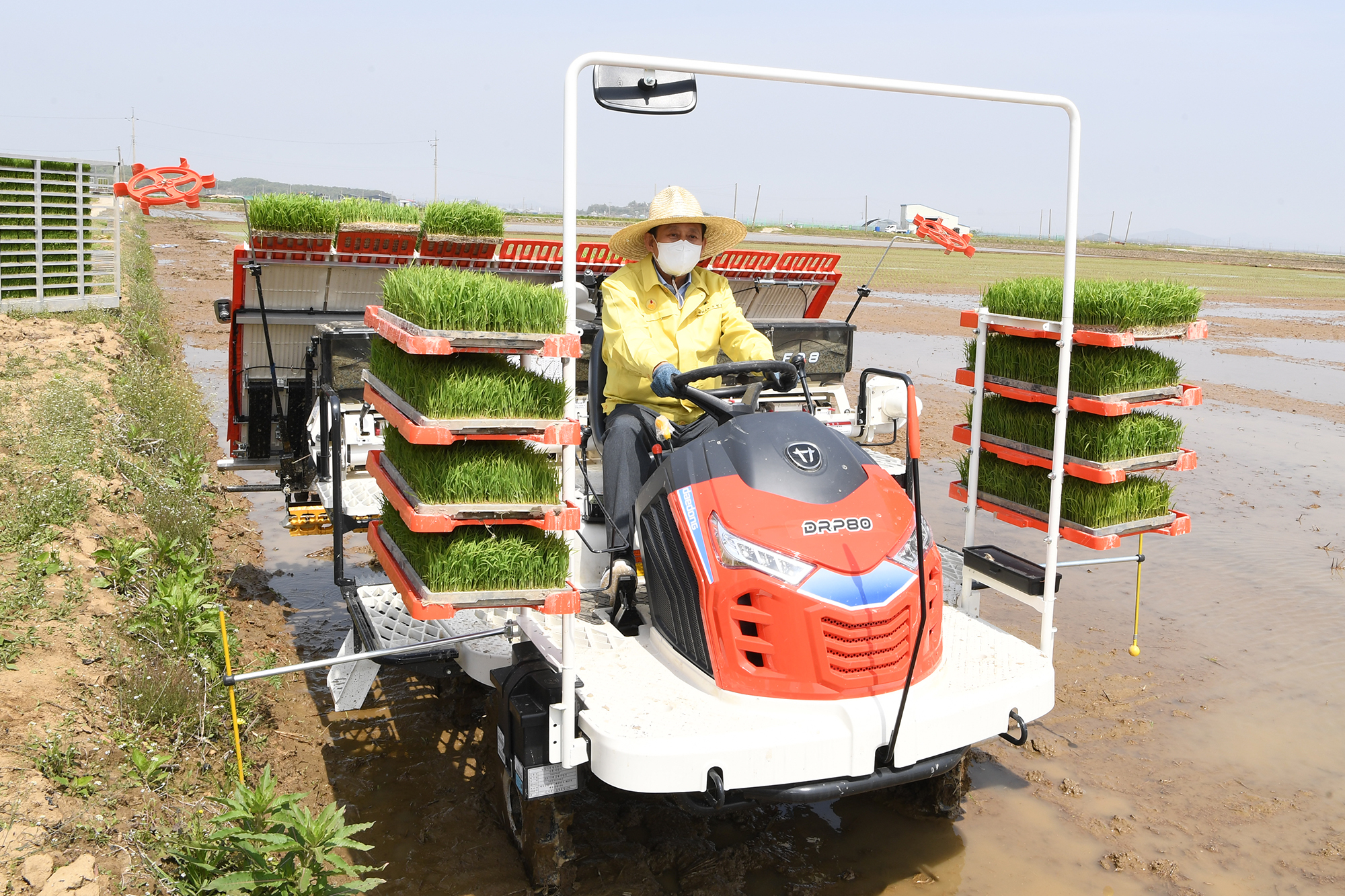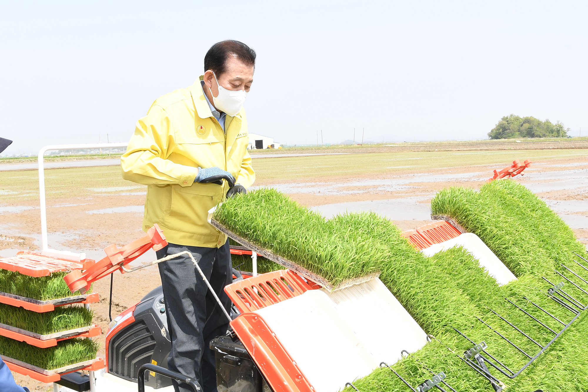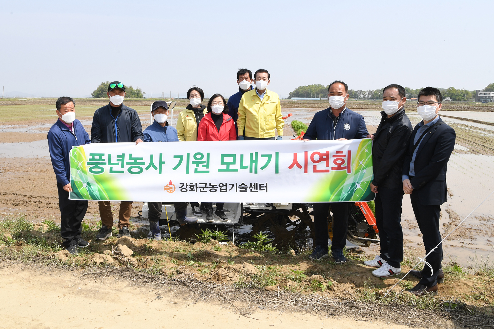 유천호 강화군수는 본격적 영농철을 맞아 6일 교동면 고구리 들녘에서 모내기 시연을 하고 풍년농사를 기원했다.