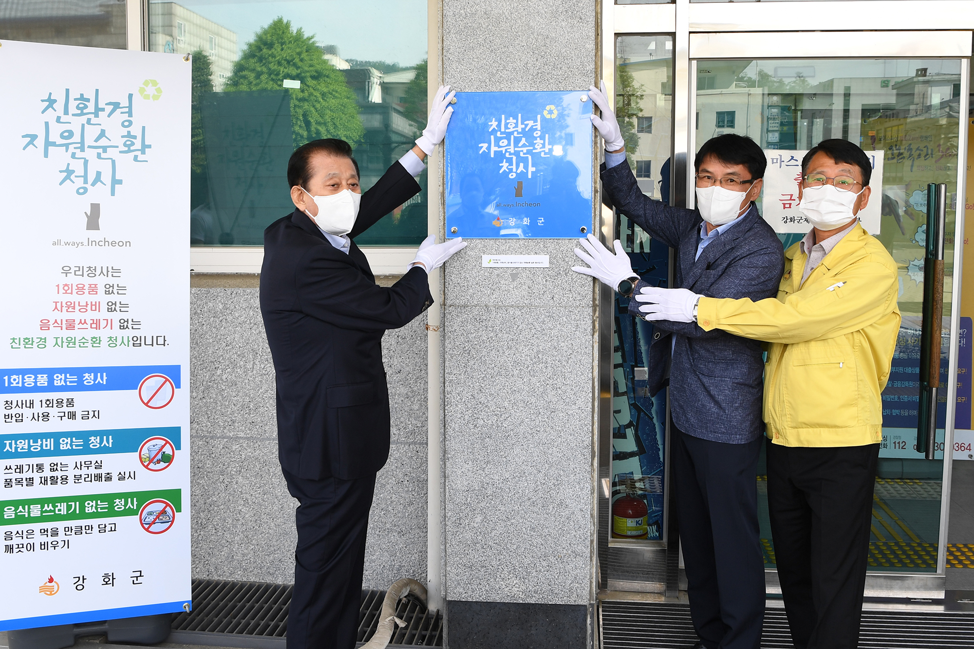 강화군(군수 유천호)은 11일 ‘친환경 자원순환 청사 현판식’을 갖고 ‘3無(1회 용품 없는, 자원낭비 없는, 음식물쓰레기 없는)실천’으로 친환경 자원순환 청사 운영을 본격화한다.