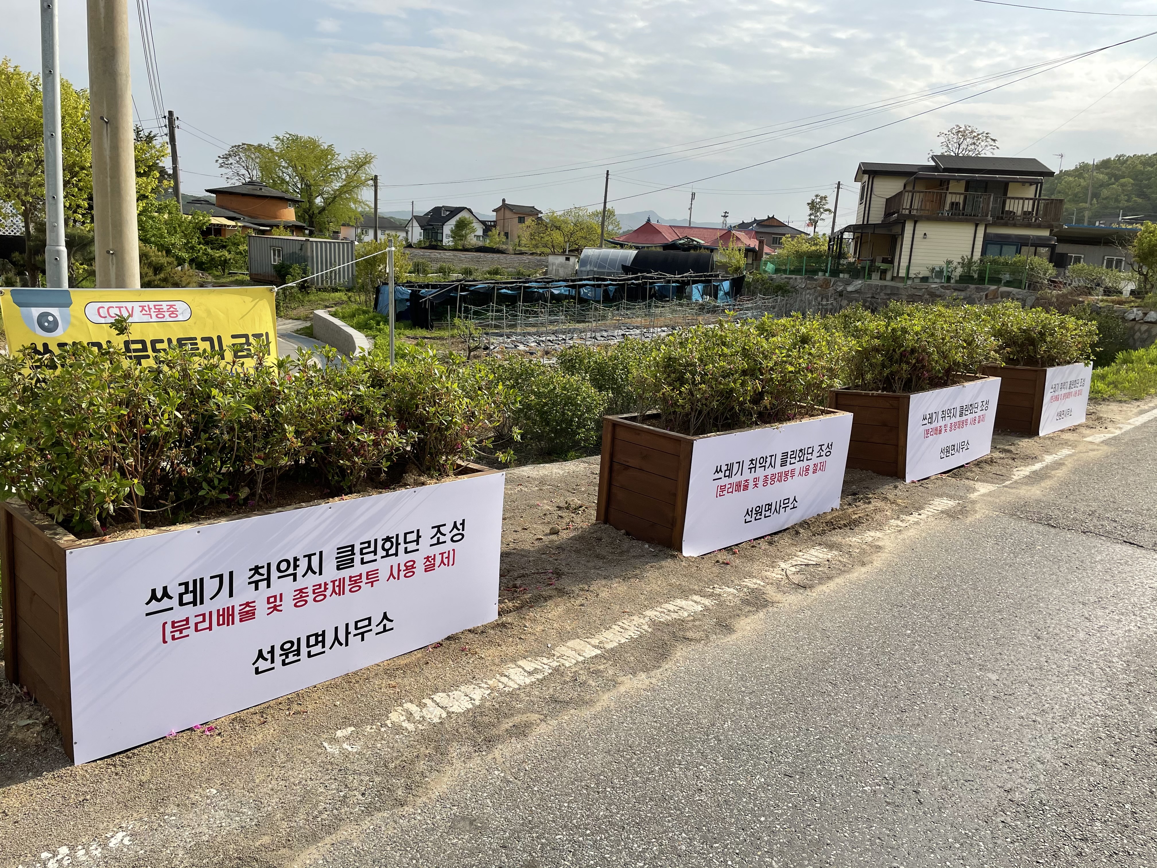 선원면은 아름다운 마을 이미지 제공을 위해 그동안 불법 무단투기로 미관을 저해하던 각종 쓰레기들을 수거하고, 무단투기 단속용 현수막과 함께 자산홍 200여 주의 관목을 식재했다. 이번 클린 화단 조성을 시작으로 무단투기 근절과 취약지역 정비를 위한 신규 화단 및 쉼터 조성을 계속해서 추진해 나갈 계획이다.