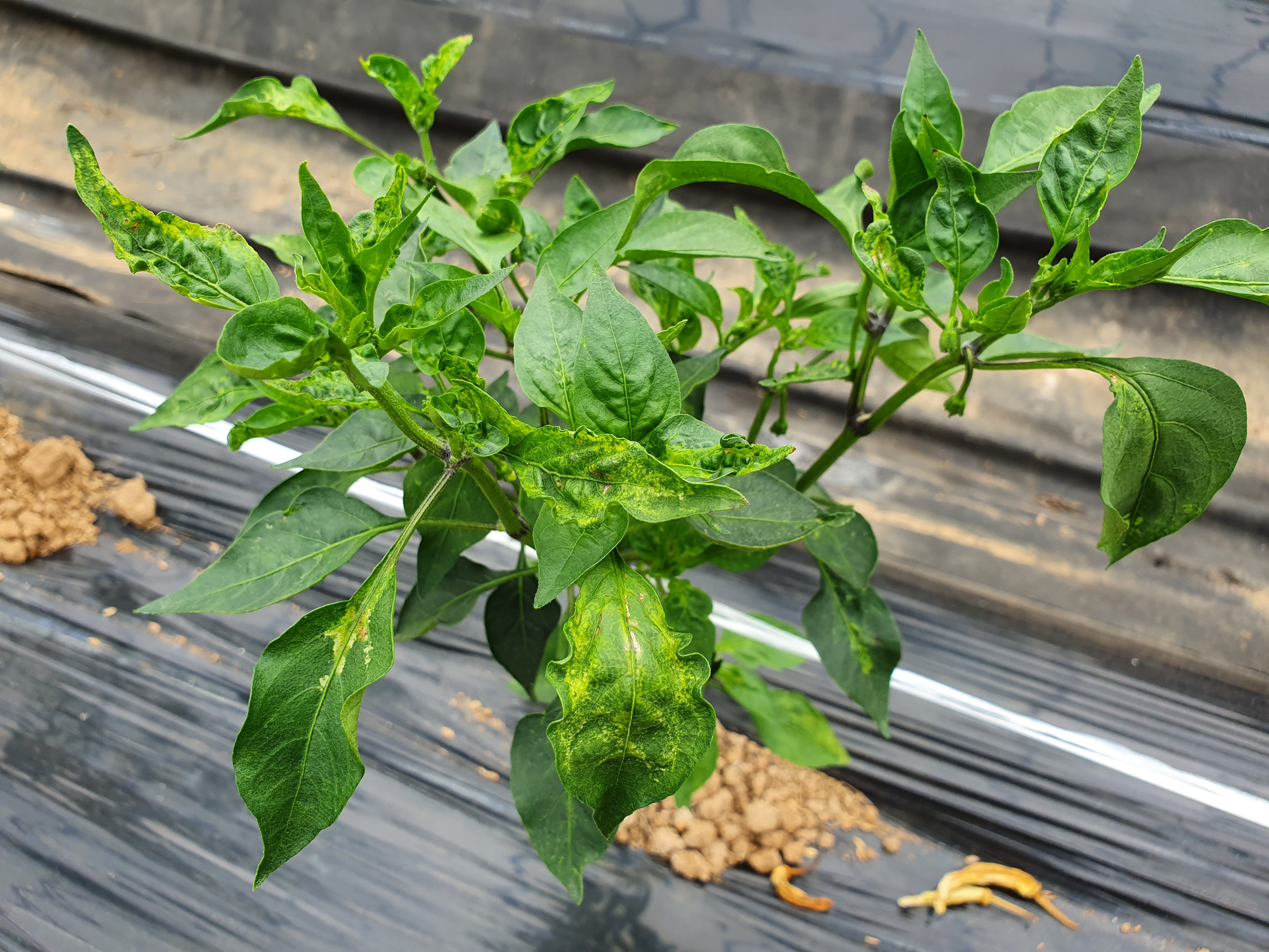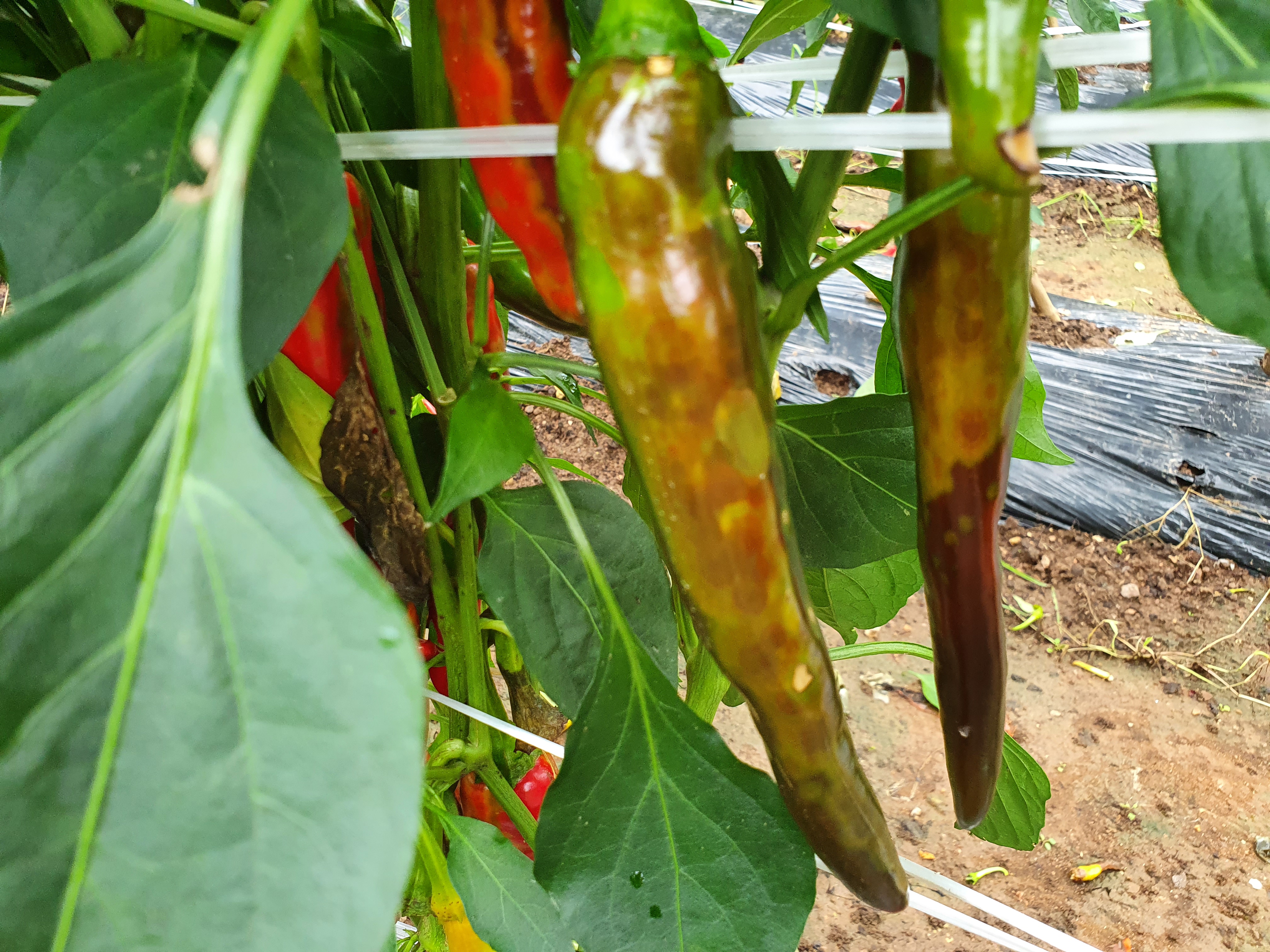최근 자주 발생하는 토마토반점위조바이러스(TSWV)는 발병초기 선단부위가 연녹색으로 변하다 검은 반점이 나타나고 아래로 구부러지면서 시들어 잎이 정상적으로 활착이 안되는 증상을 보인다. 유묘기를 지나 고추열매가 달려도 둥근 형태의 칼라무늬가 나타나 ‘칼라병’이라고도 한다.