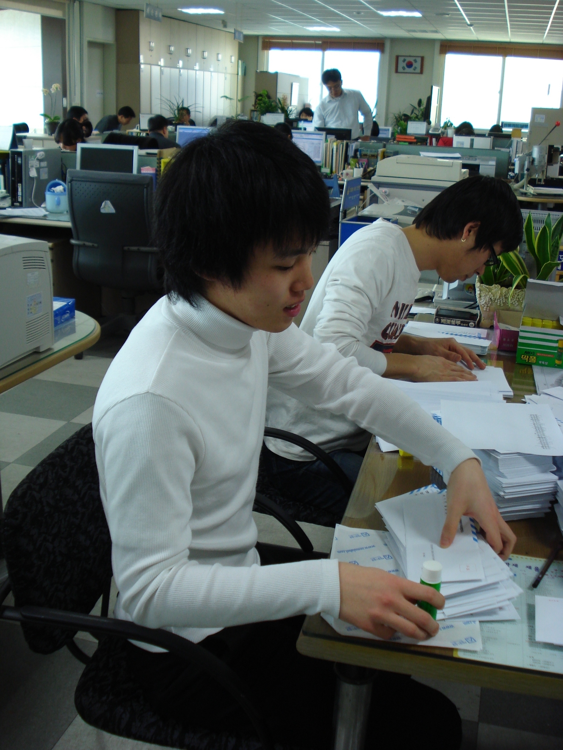 (사진설명 : 직장체험에 참가한 정성현 군이 민원인에게 보낼 안내문을 정리하고 있다)
