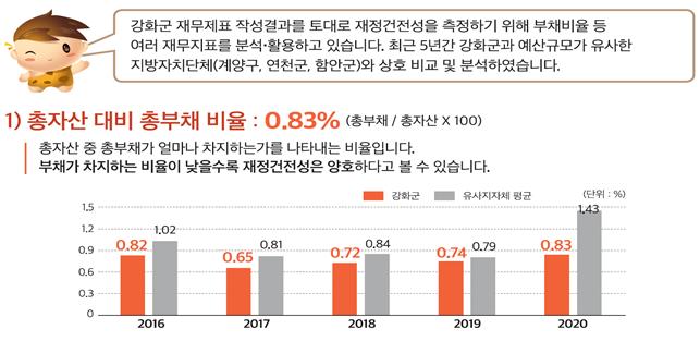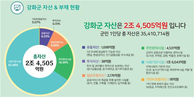 강화군 총자산은 2조 4,505억 원이며, 공무직 퇴직금, 국·시비 사업 집행잔액 등이 포함된 부채는 203억 원으로 유사 지자체 대비 부채가 낮다. 또한, 대규모 재정사업 등을 위해 금융기관에서 빌린 채무가 없어 재정건전성이 매우 우수하다.