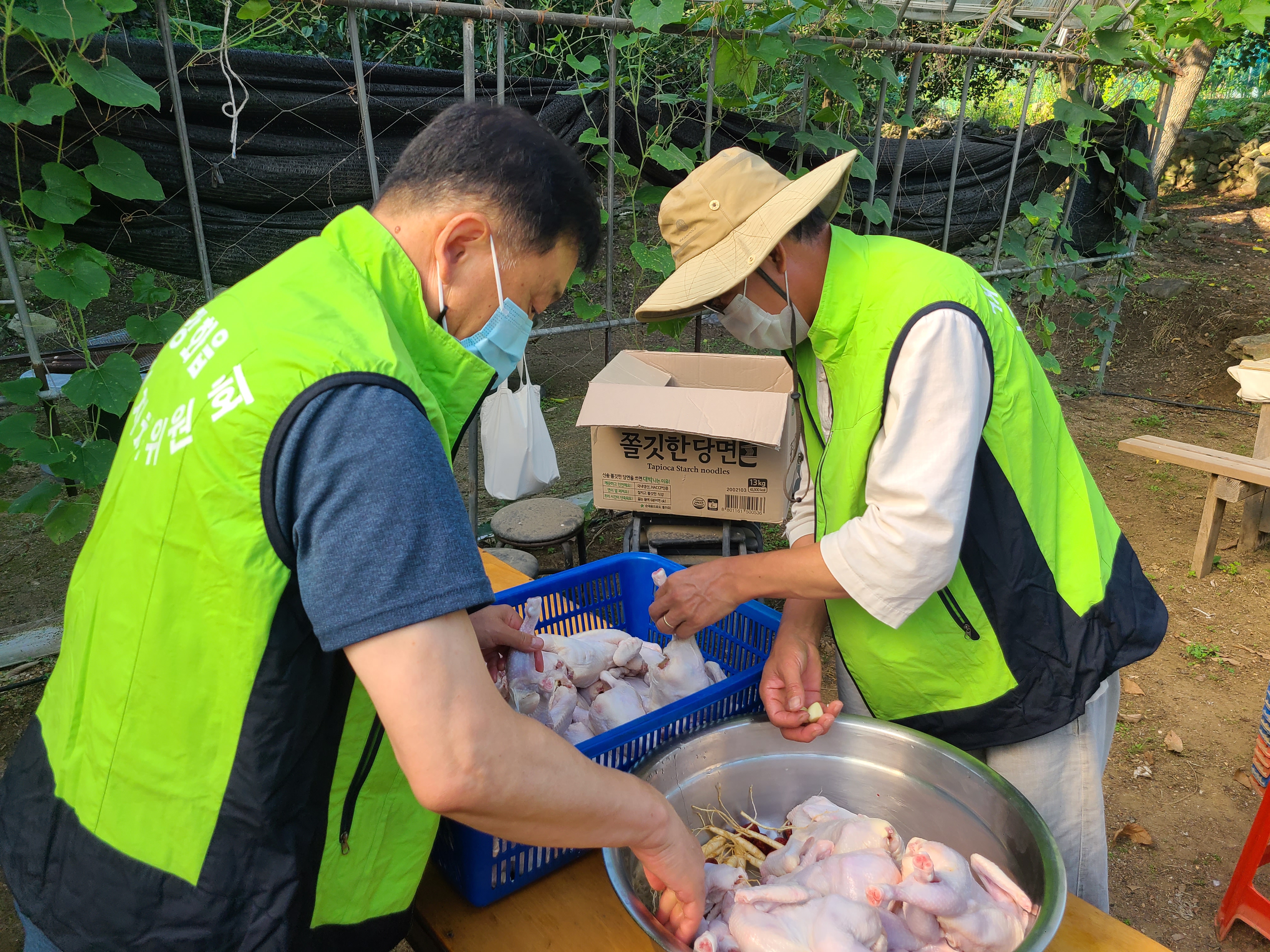 손질이 끝난 닭을 펄펄 끓는 물에 삶아 내는 봉사자들 얼굴에는 비지땀이 비 오듯 쏟아졌으며, 다 익은 삼계탕을 150그릇을 만들어 냈다. 오후가 되자 이들은 가가호호 정성껏 만든 삼계탕을 들고 강화읍에 사는 독거노인 집을 직접 찾았으며, 장기간 이어지고 있는 코로나19에 대응해 직접 배달을 실시하면서도 ‘비대면 문 앞 배송’으로 이날 행사를 마무리했다.