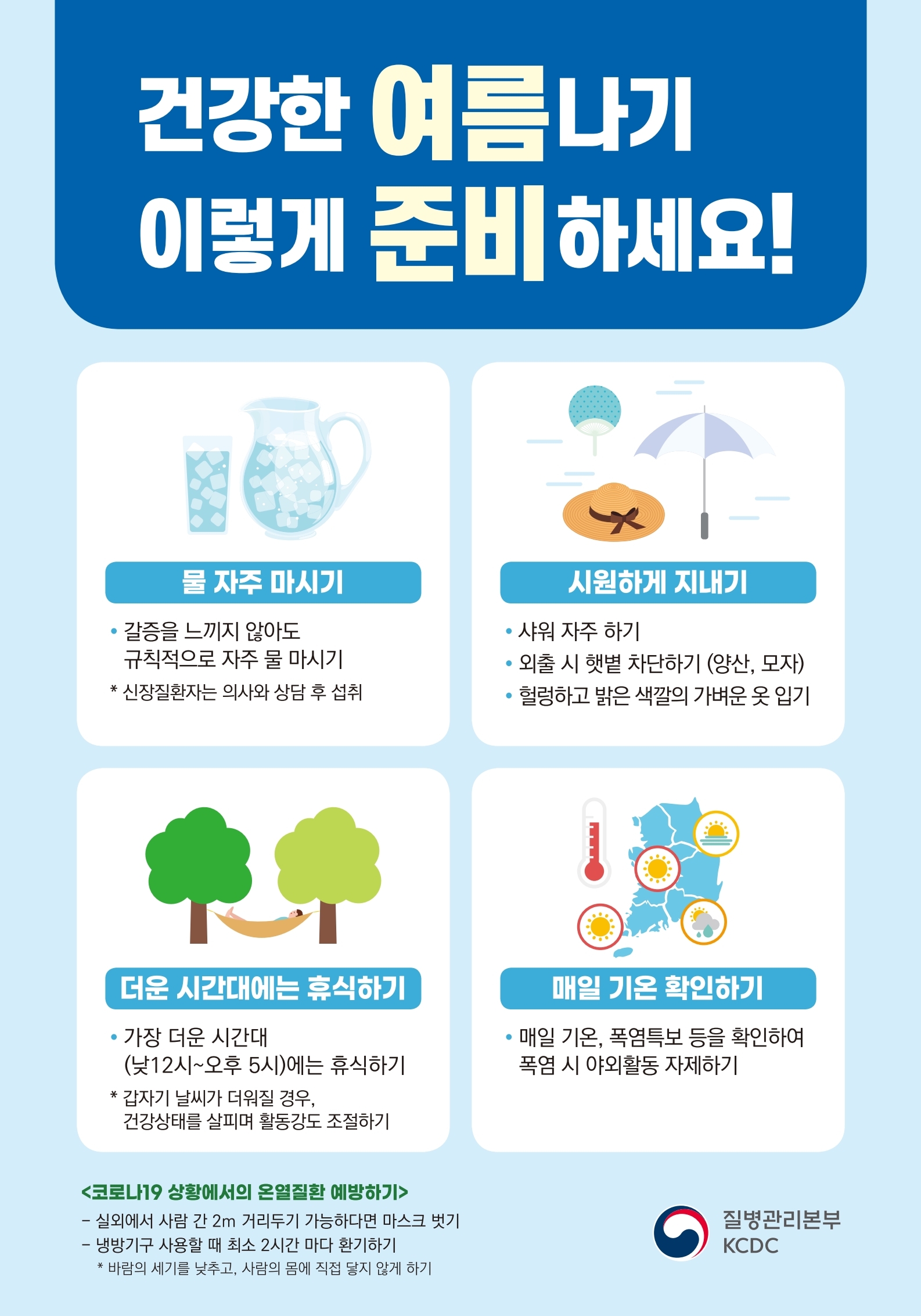 부득이한 야외 활동 시에는 나 홀로 활동은 피하고 그늘에서 자주 휴식을 취하고 수분을 충분히 섭취해야 한다. 또한, 어지러움, 두통 등 이상 증상을 느낀다면 즉시 휴식을 취하고 119 또는 주변에 도움을 청해야 한다고 당부했다.