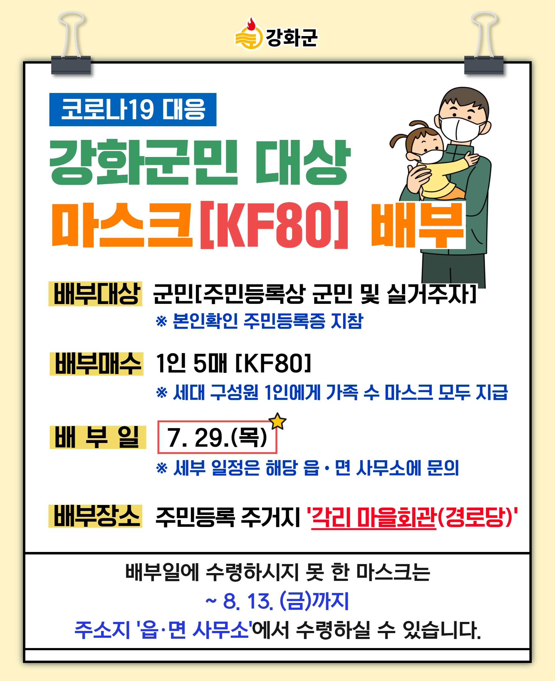 이번에 배부하는 마스크는 무더위에 상대적으로 편한 KF80 마스크이다. 기한 내 수령하지 못한 마스크는 다음달 13일까지 주소지 읍‧면사무소에서 수령할 수 있다.